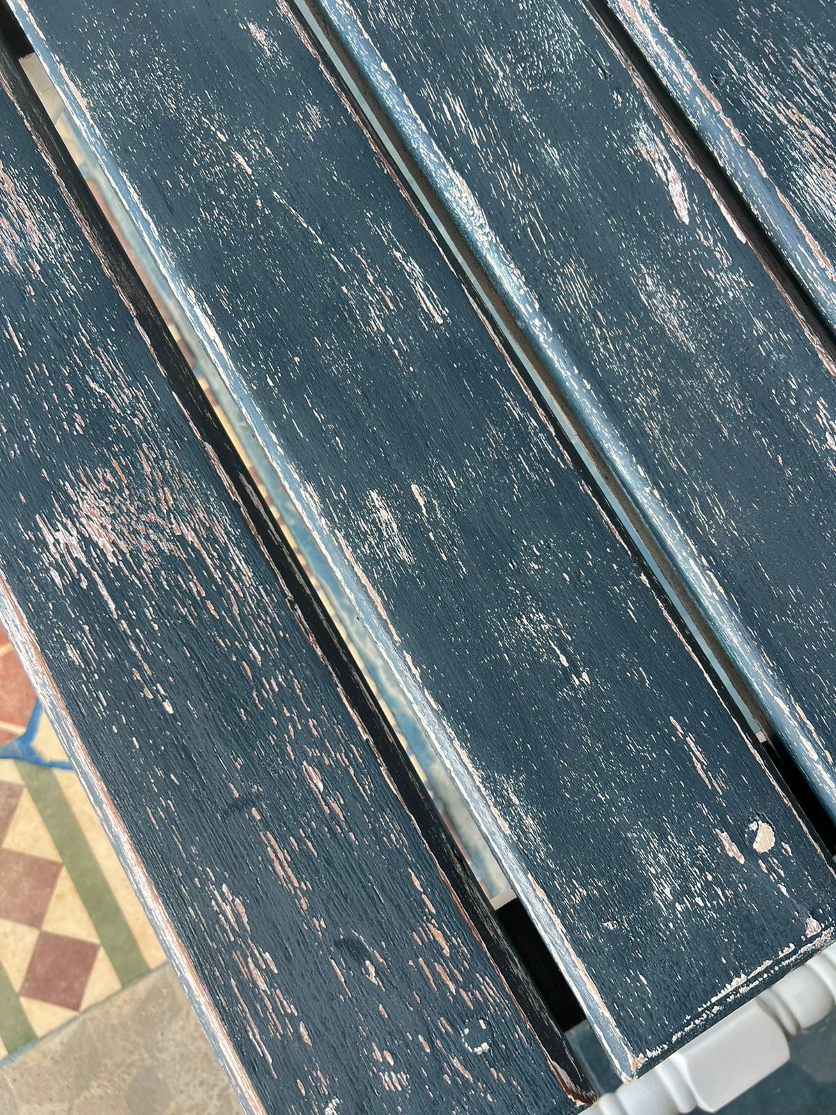 Feita de madeira maciça reutilizada, tampo com pintura patinada e base pintado de branco.