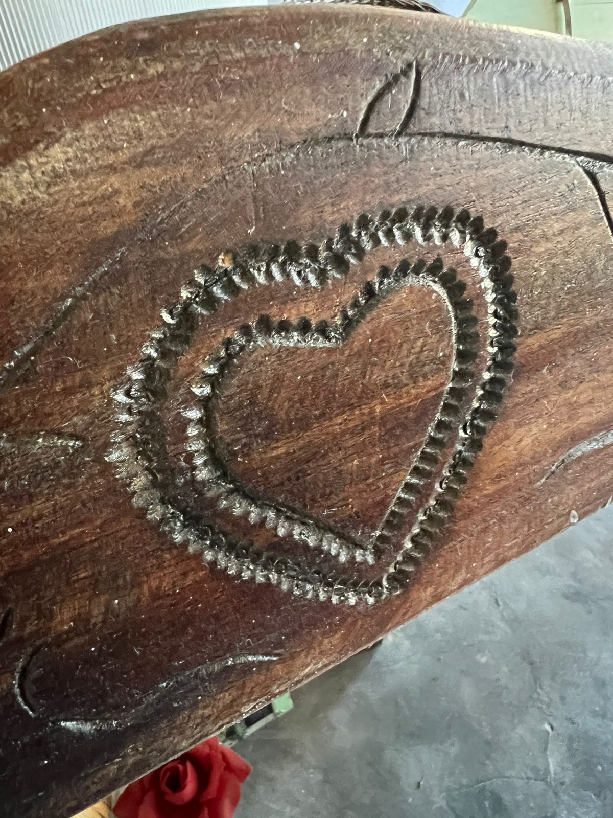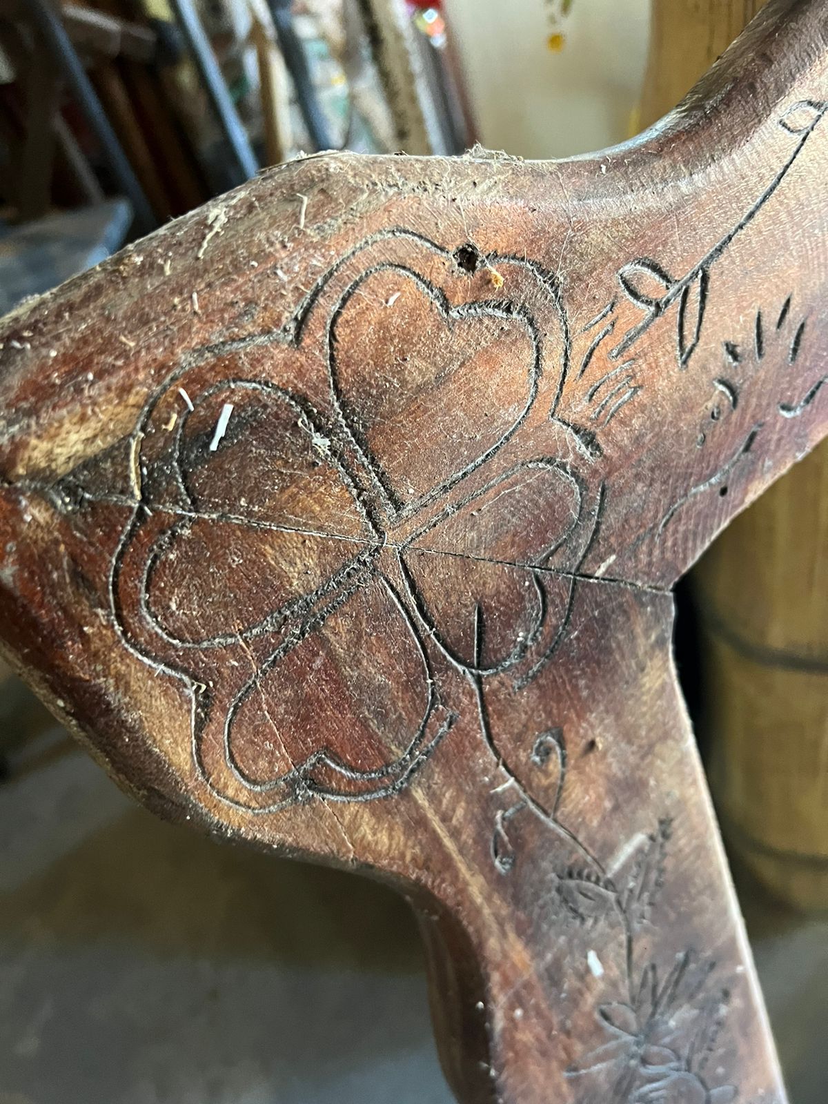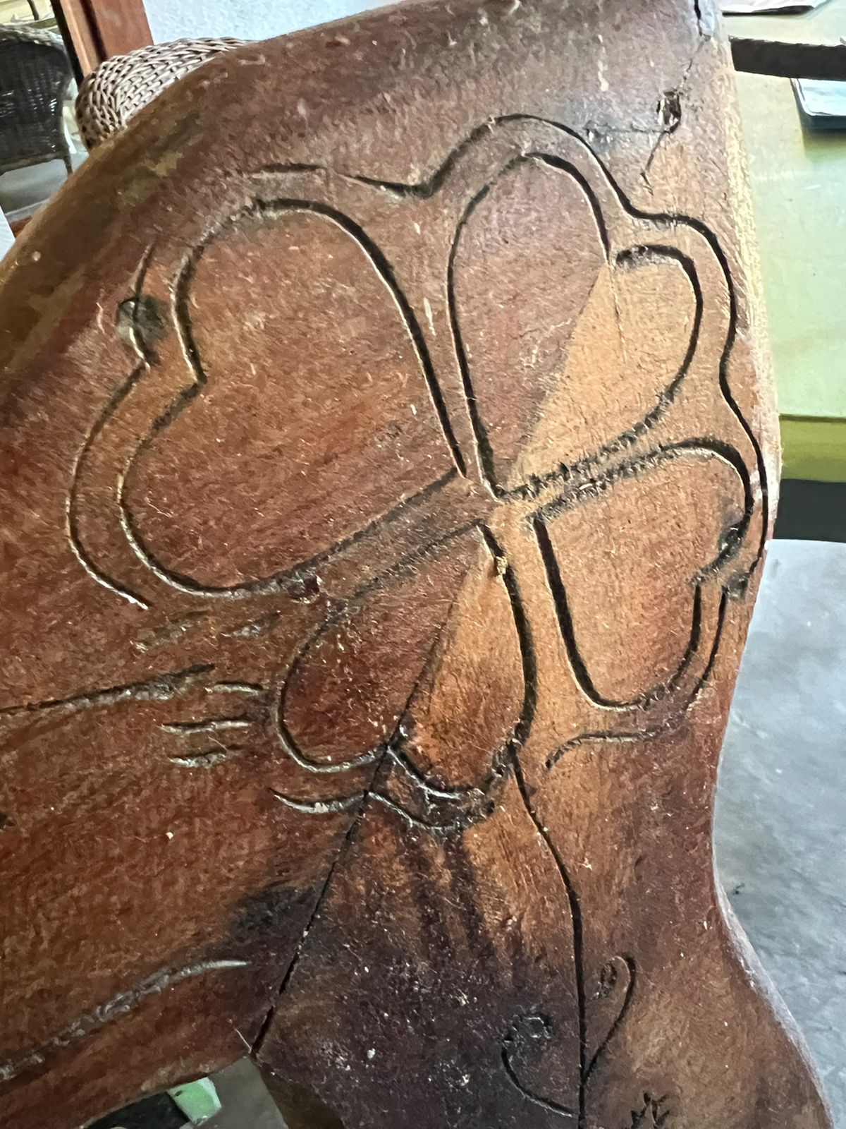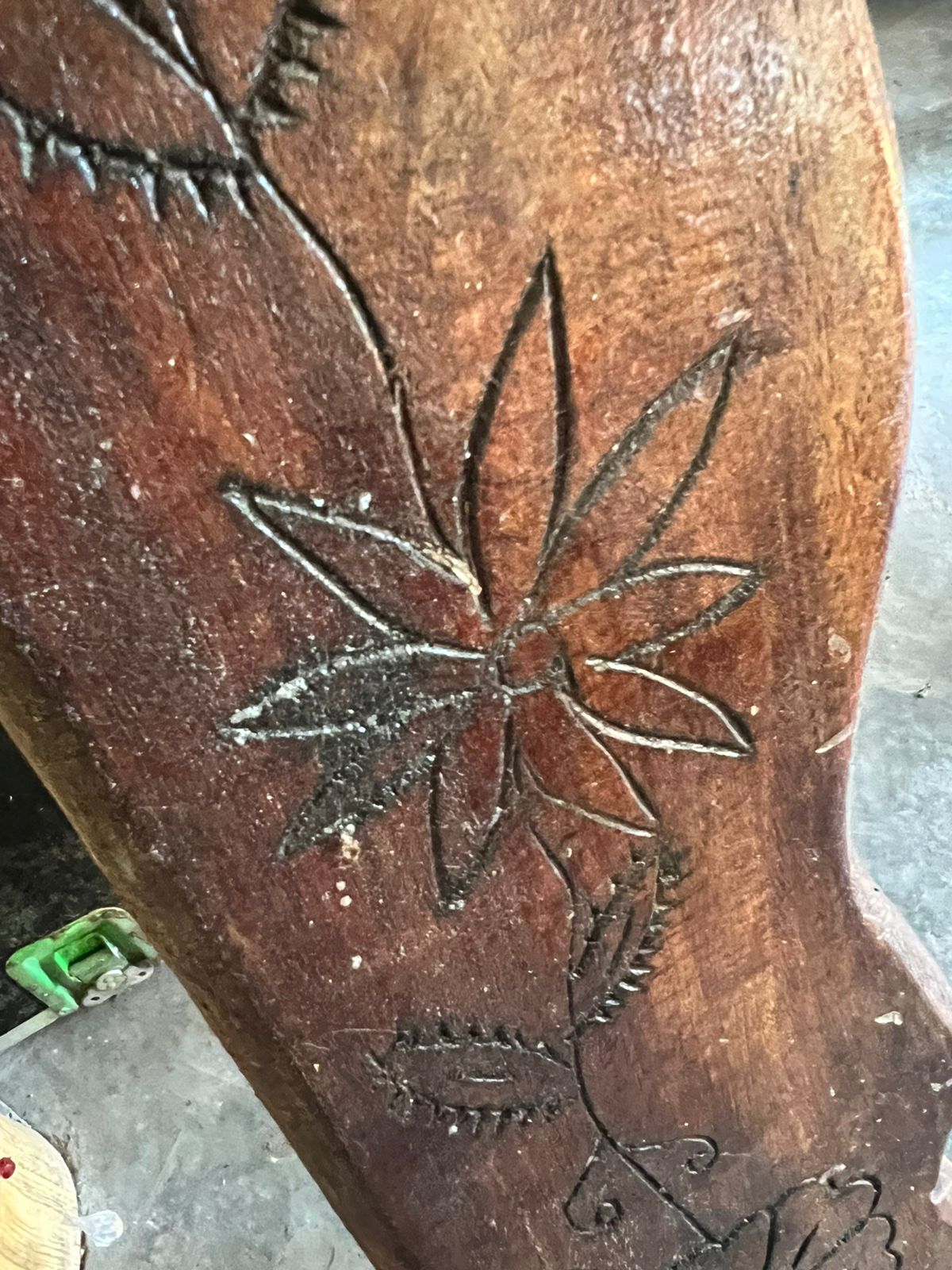 Peça antiga, feita de madeira maciça, sem acabamento. Possui diversos detalhes entalhados.