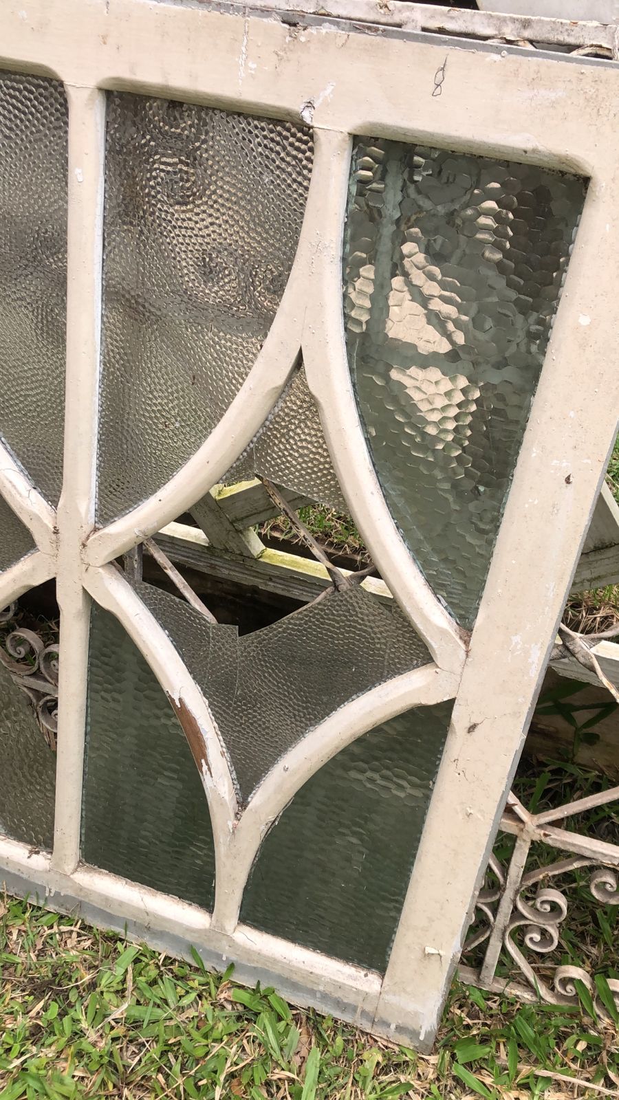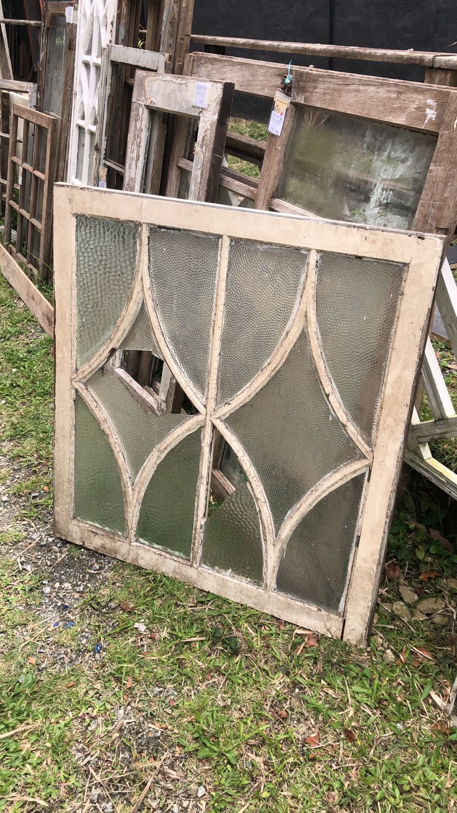 Folha de janela antiga de madeira maciça de demolição, peça sem acabamento, com vidro texturizado.