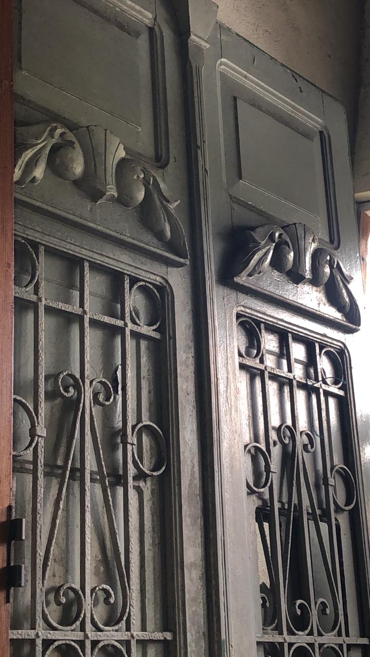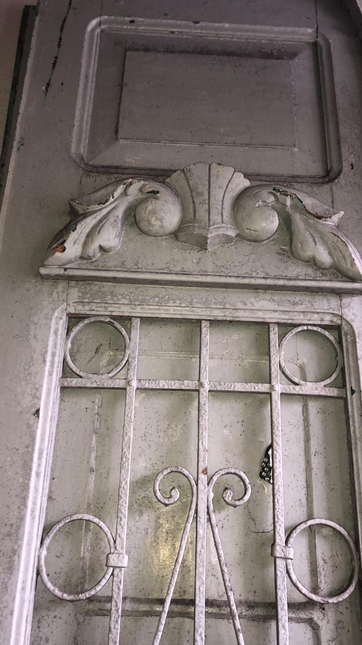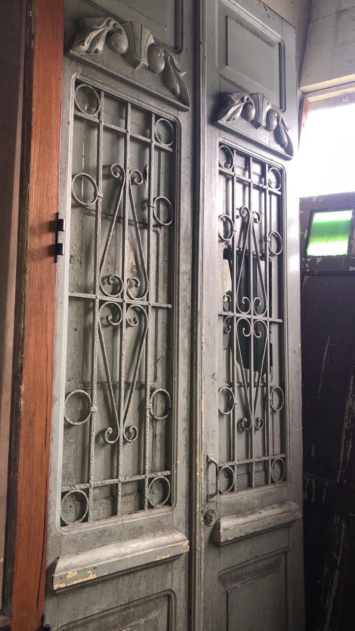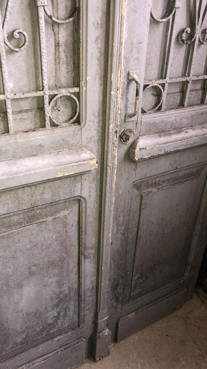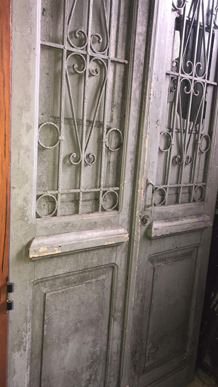 Portas cinza em madeira maciça, com postigos envidraçados, grades de ferro e detalhes trabalhados nas almofadas e na fechadura.