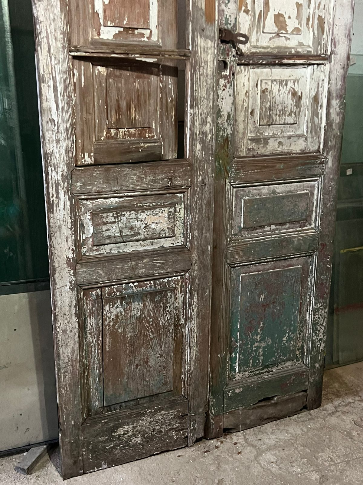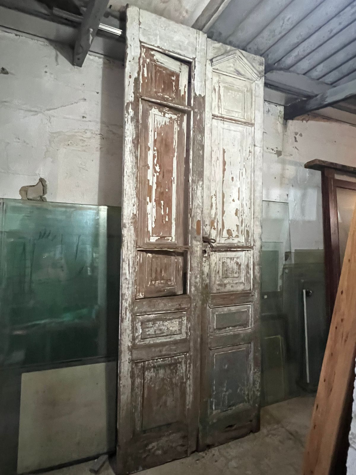 Porta alta de madeira nobre de demolição, peça sem acabamento, com imponência que se destaca pela altura diferenciada. Possui postigo e diversas almofadas entalhadas, ideal para restauração.
