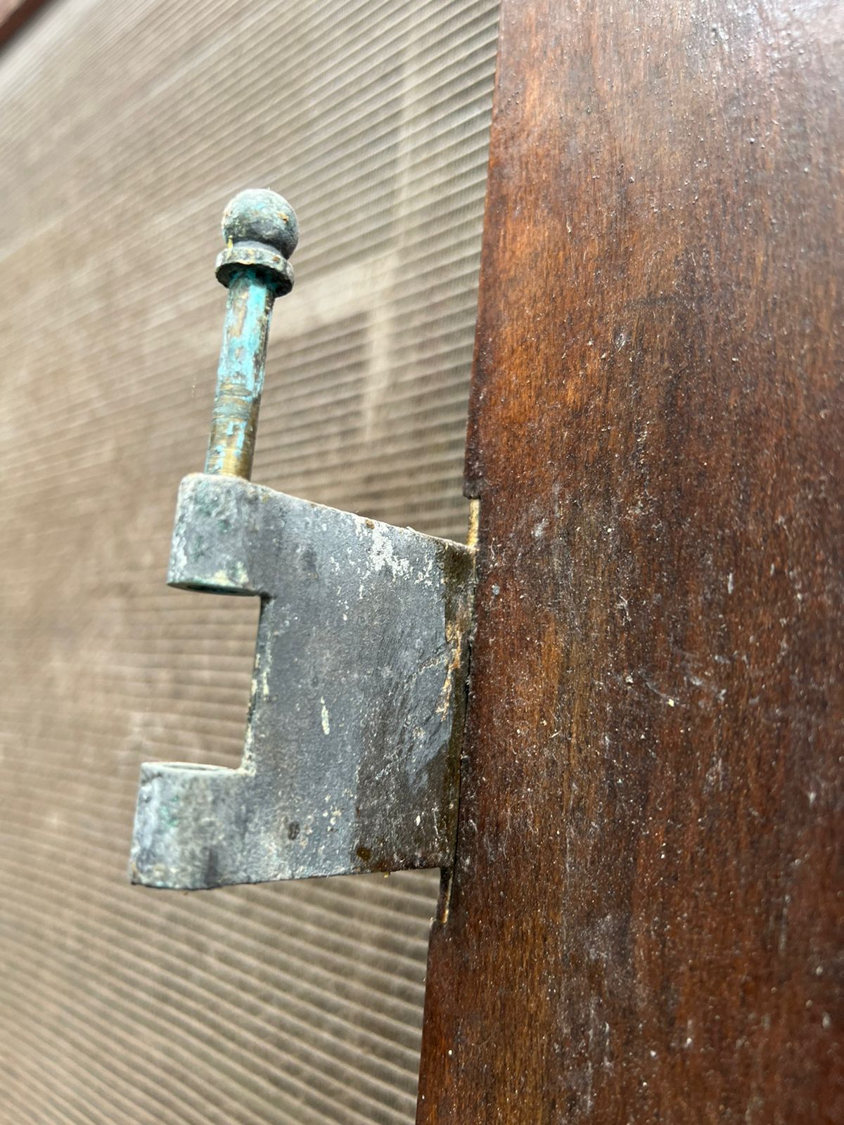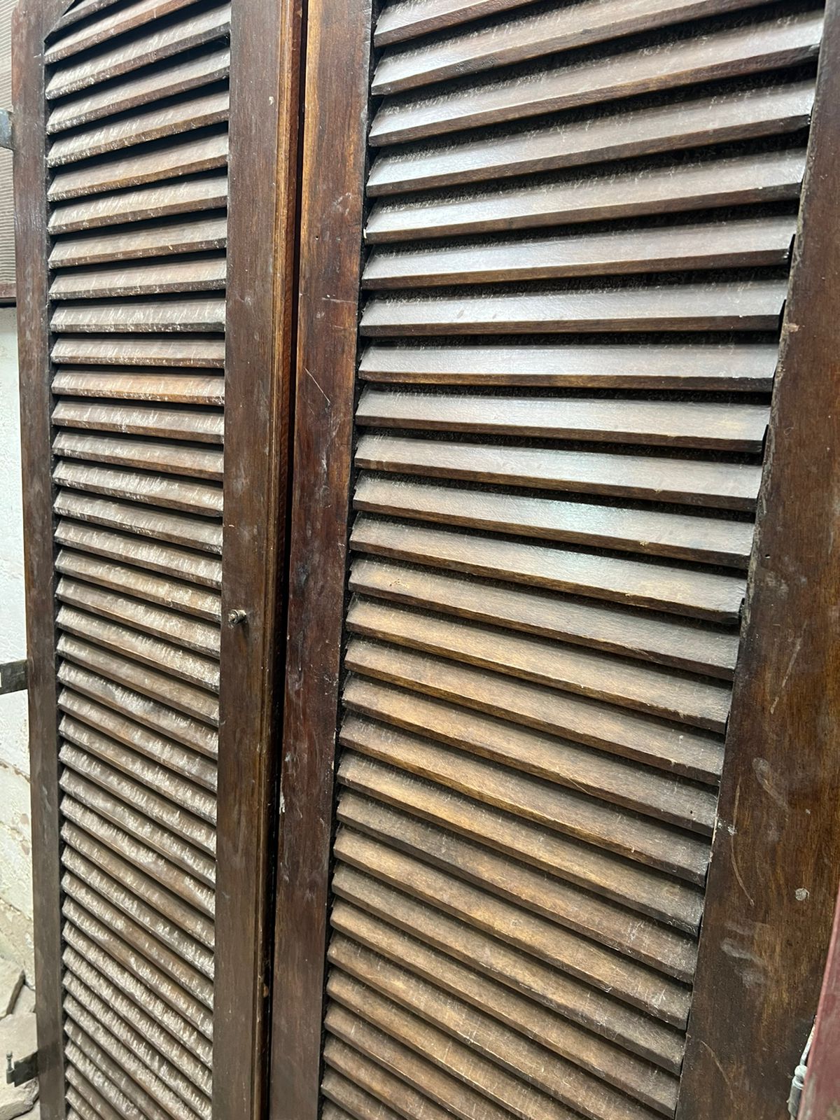 Feito de madeira maciça, sem acabamento. Formato em arco superior, as duas folhas são de veneziana. Não possui batente.