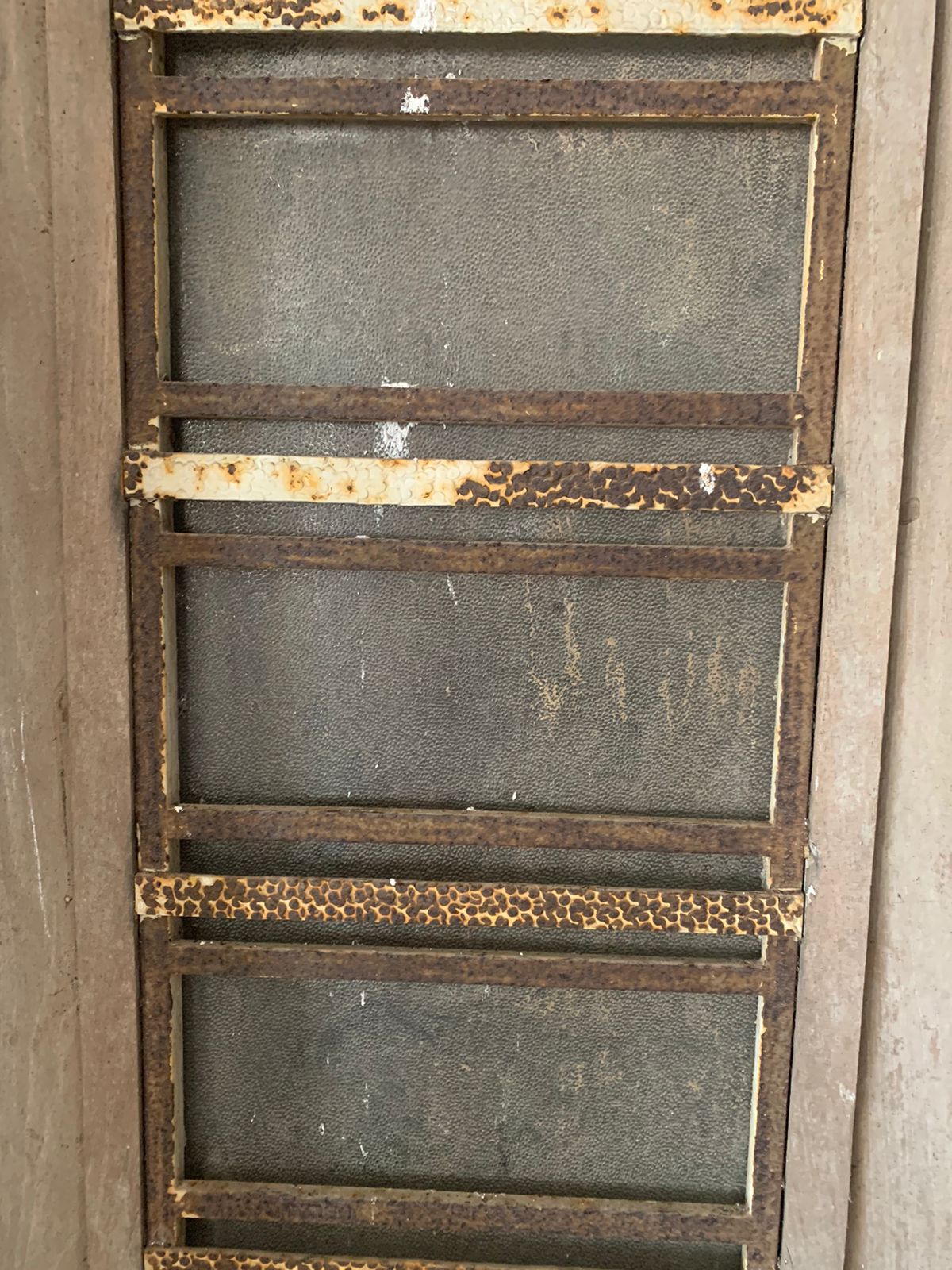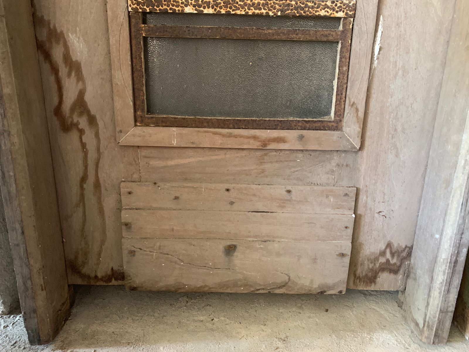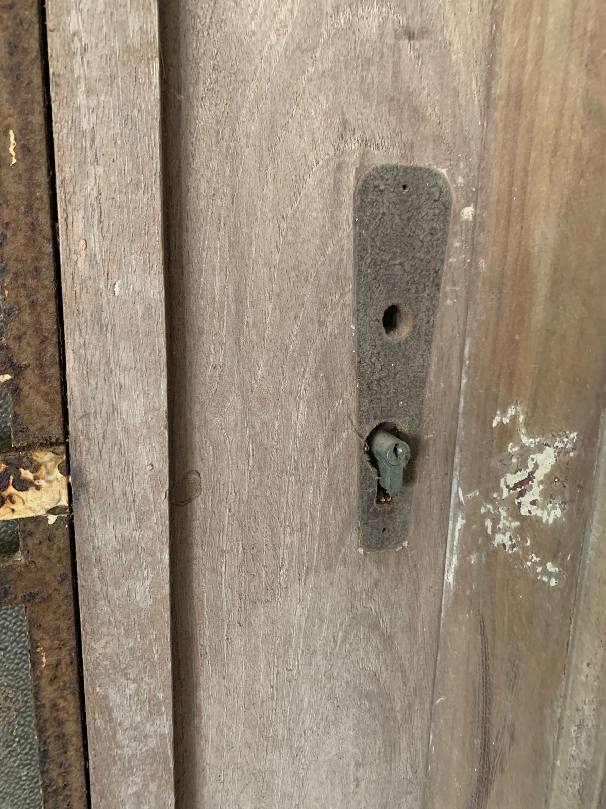 Porta de cabreúva com grade de ferro trabalhada e batentes.