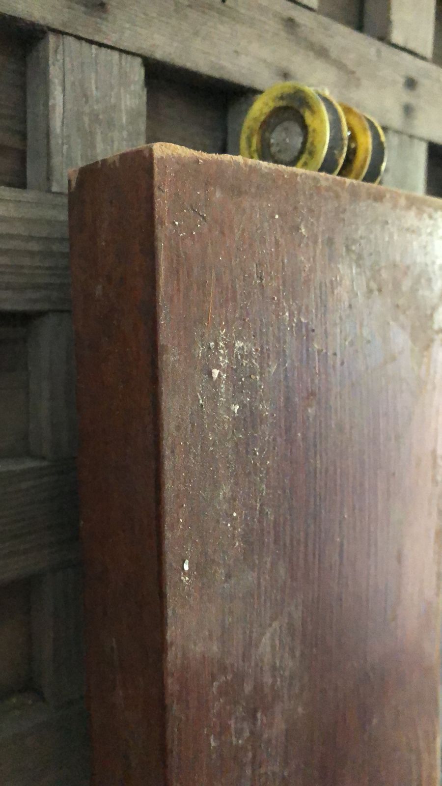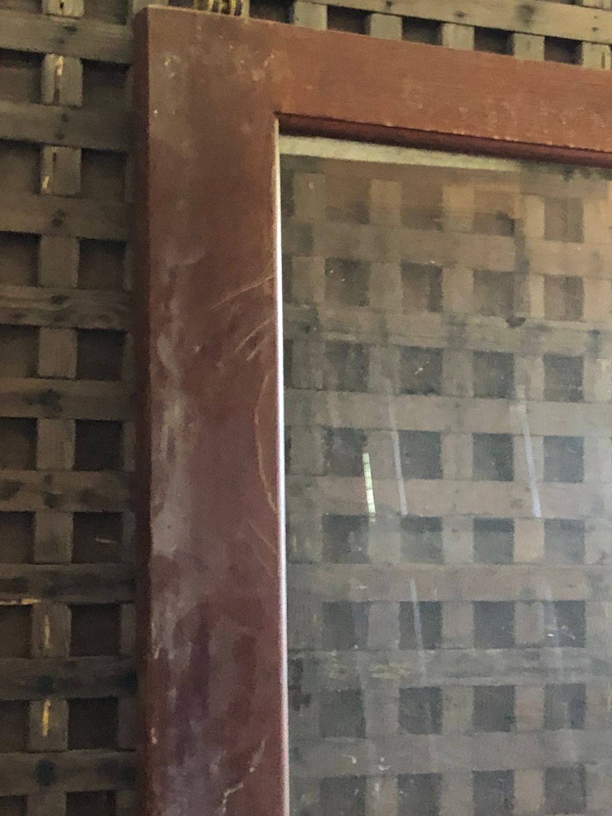 Peça feita de madeira, sem acabamento, cor escura. Com vidro grande e incolor.