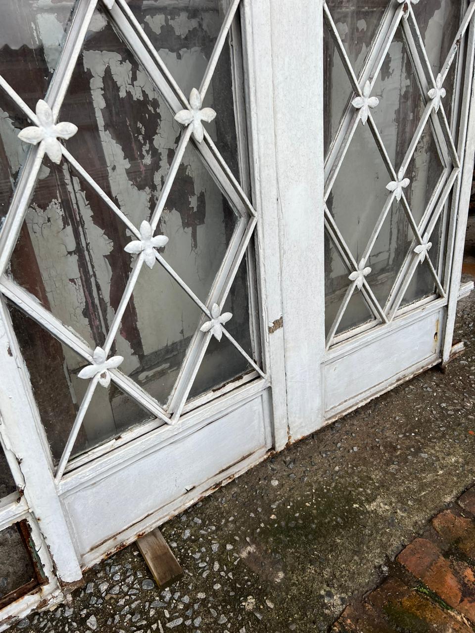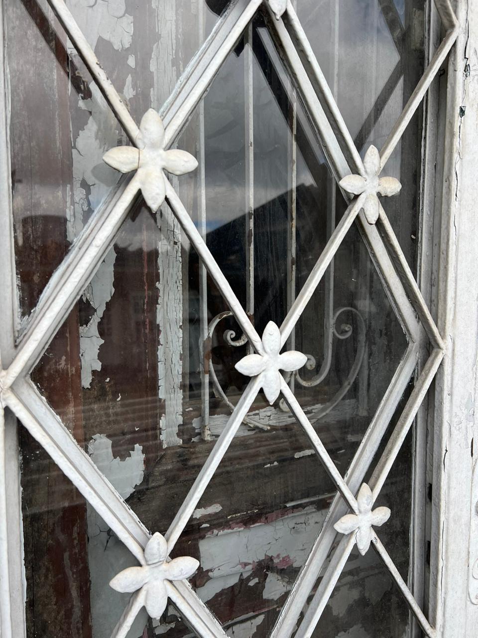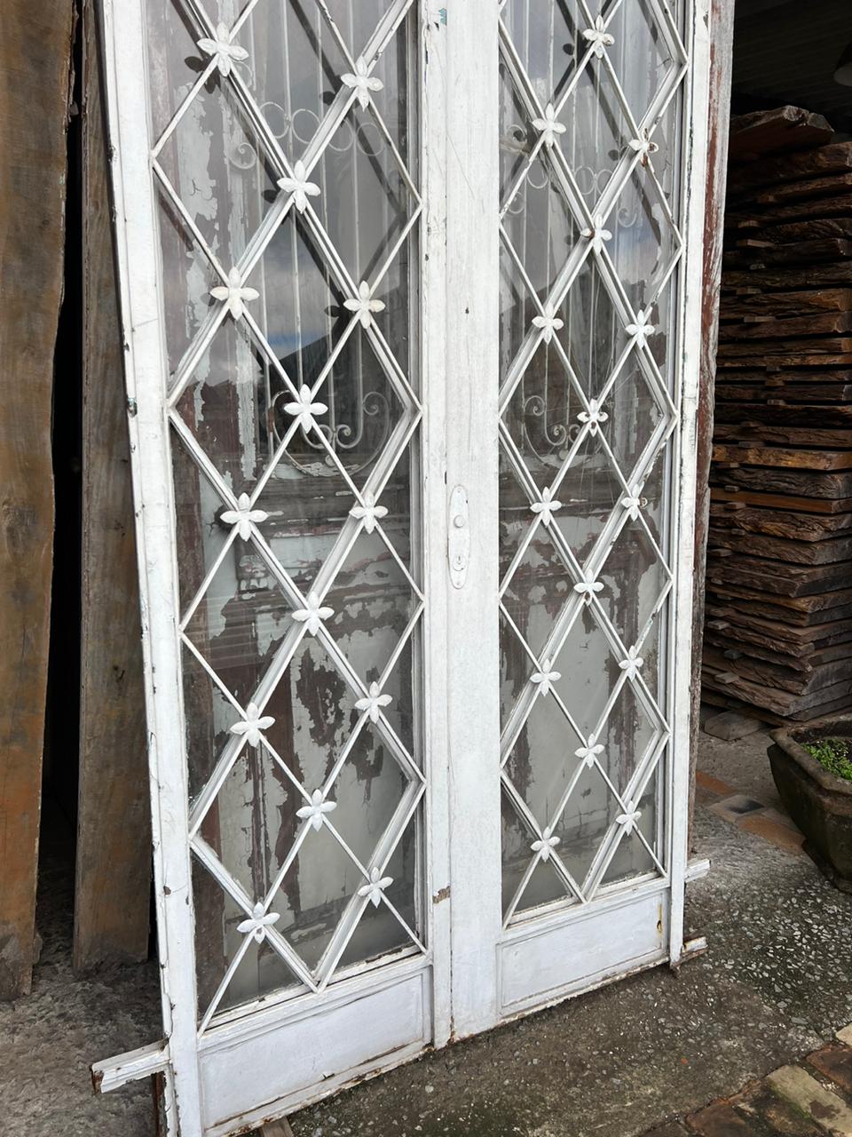 Peça antiga, sem acabamento, na cor branca. Possui postigo com vidros e grades com detalhes de flores, e bandeira superior.