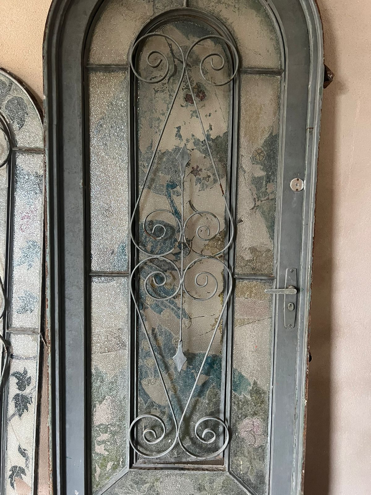 Peça antiga, de demolição, sem acabamento. Com a parte superior em formato de arco, possui postigo com vidros e grade ornamentada.