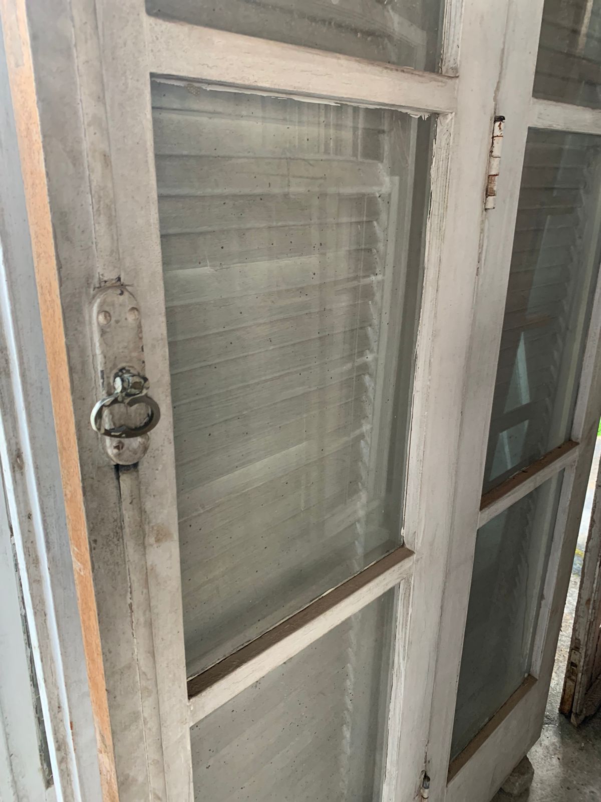Porta de madeira branca com 8 vidros retangulares, frente de vidro e atrás de veneziana.