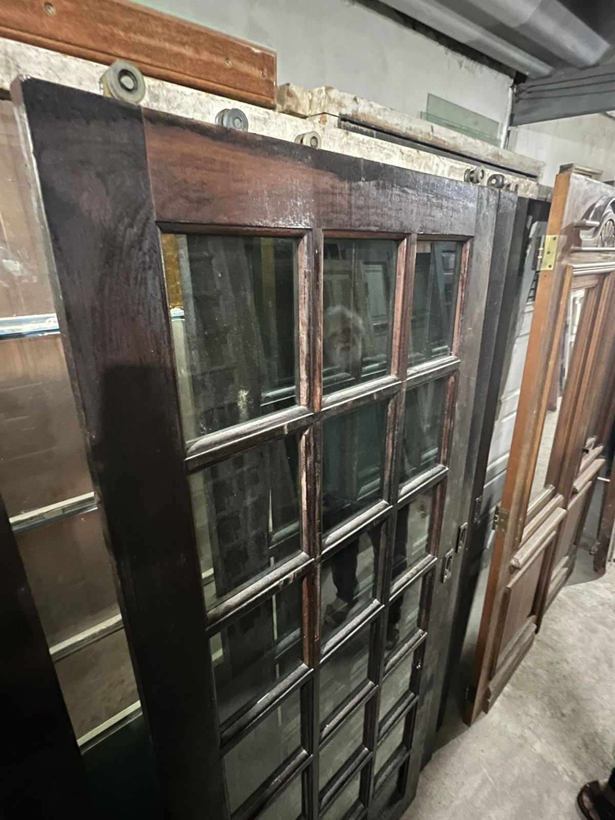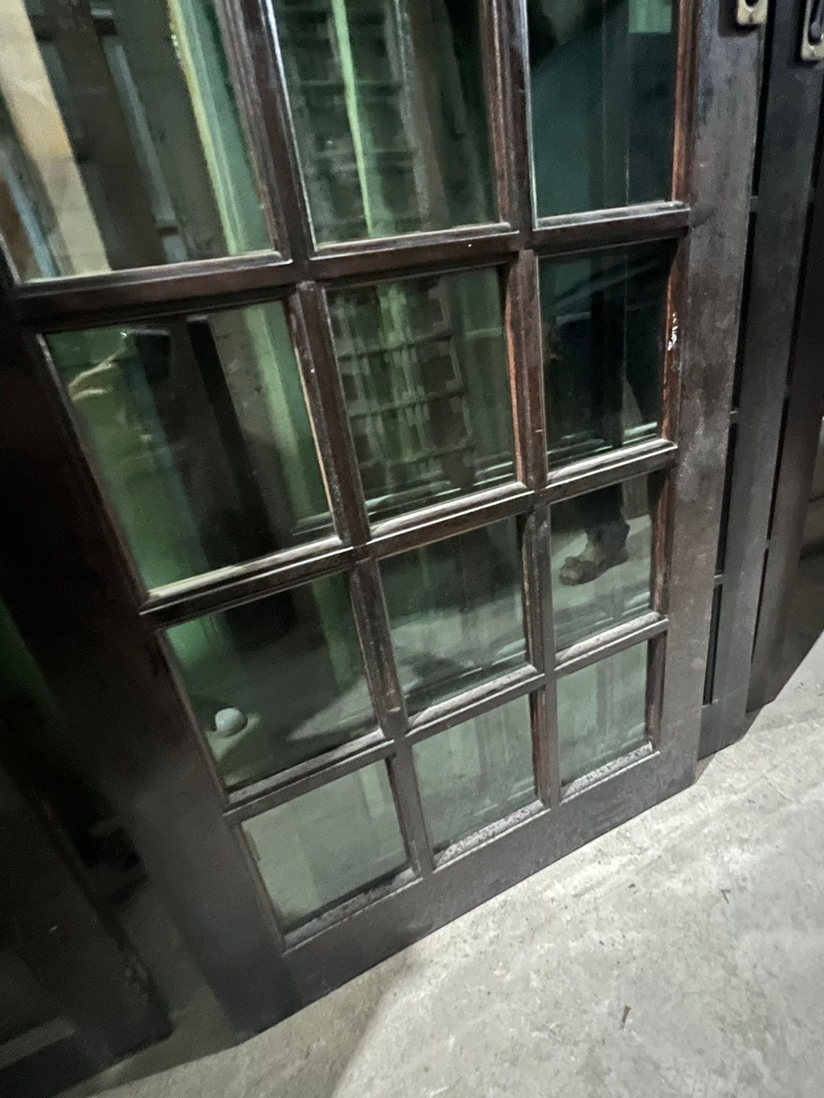 Peça de demolição, feita de madeira maciça, sem acabamento. Possui 22 vidros incolor.