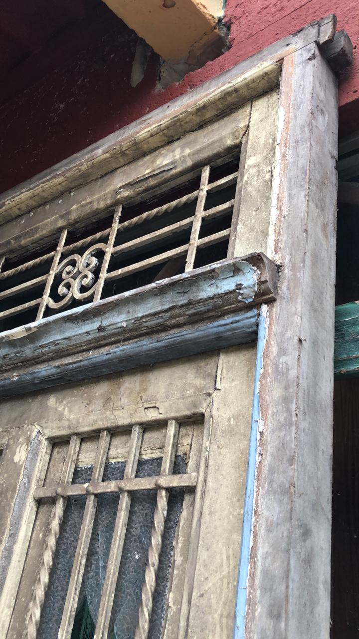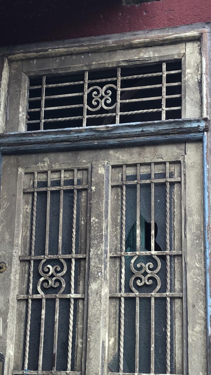 Possui entalhes sobrepostos, postigo com vidro e grade de ferro, além de bandeira superior também com grade