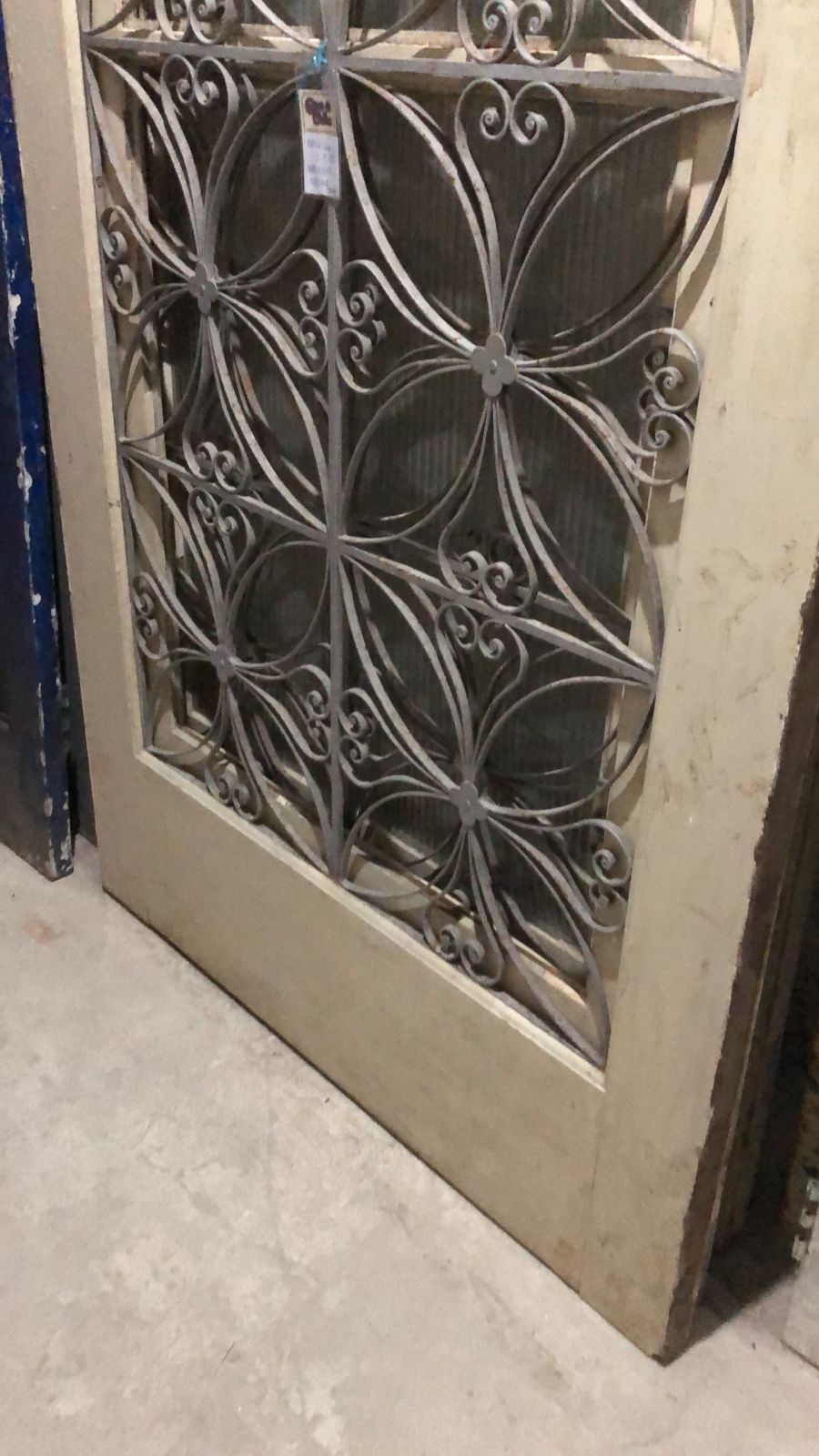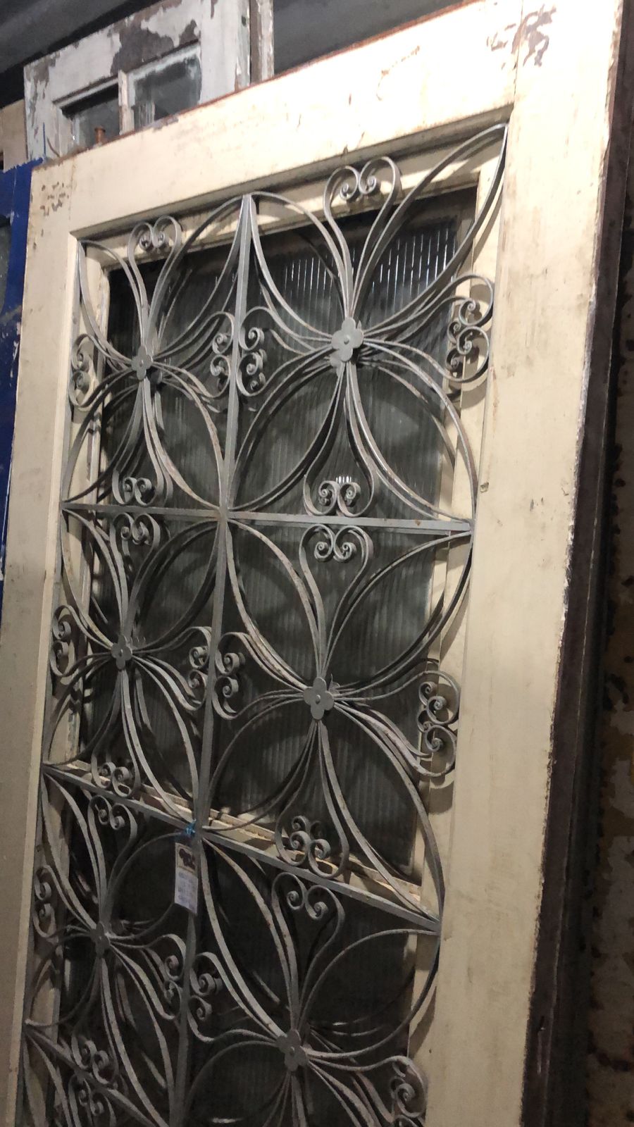 Porta de madeira maciça de demolição, peça sem acabamento, com grade de ferro ricamente ornamentada em círculos.