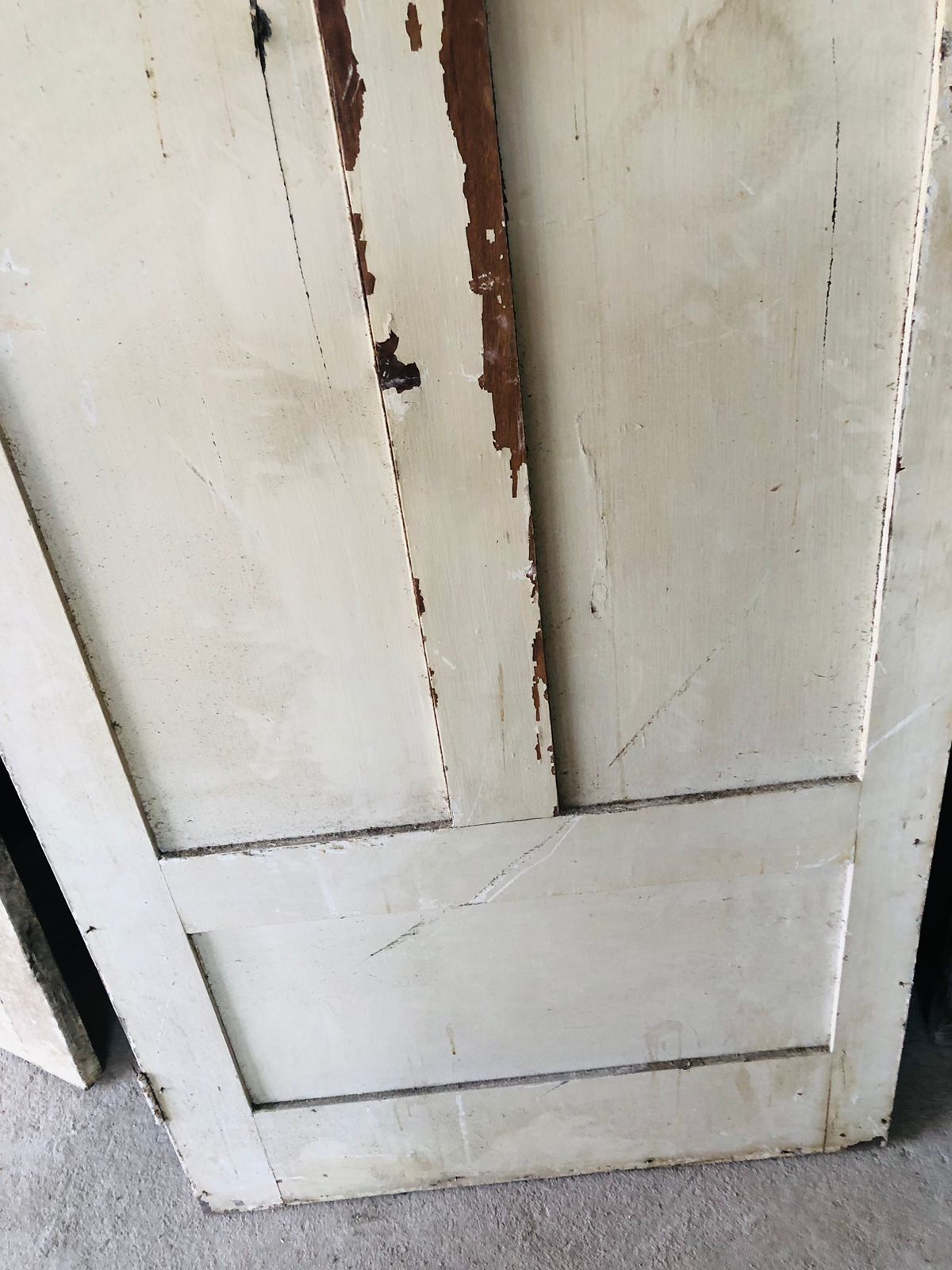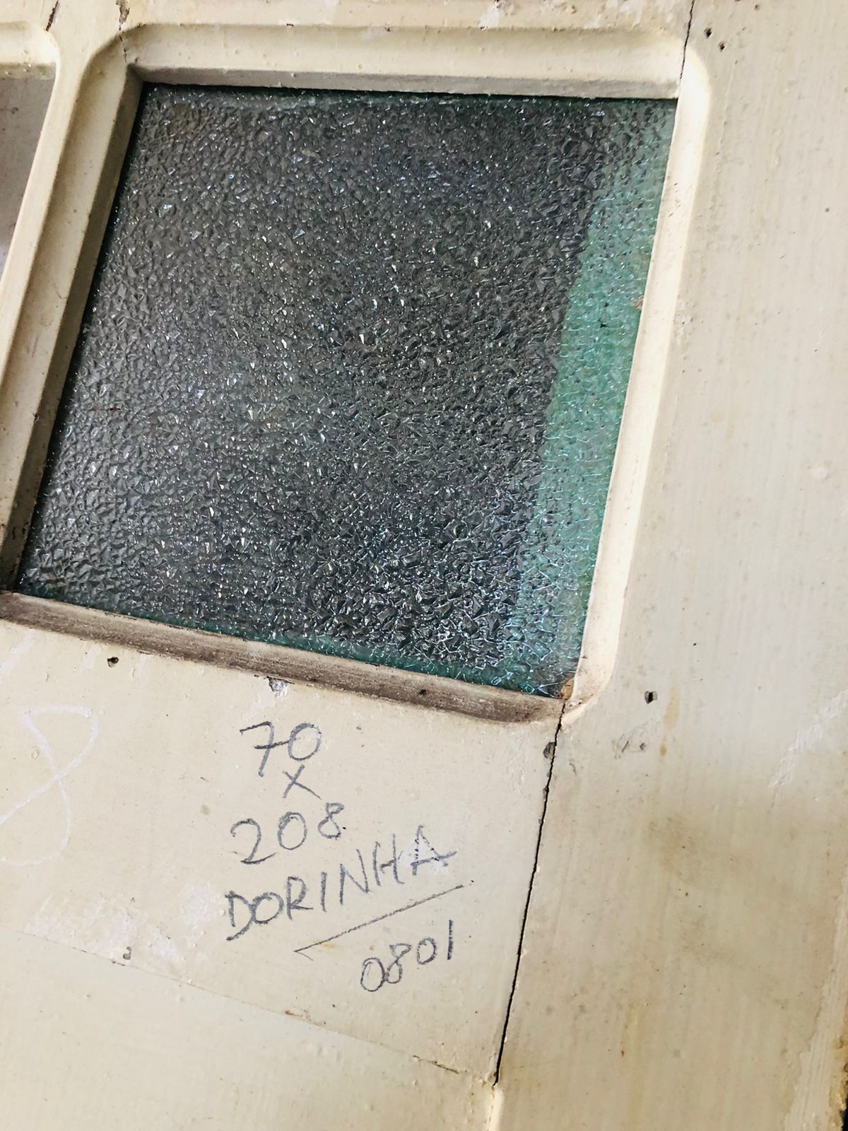 Peça de demolição, sem acabamento, ideal para restauração. Possui 6 vidros na parte superior, com detalhes de almofadas. Não tem batentes.