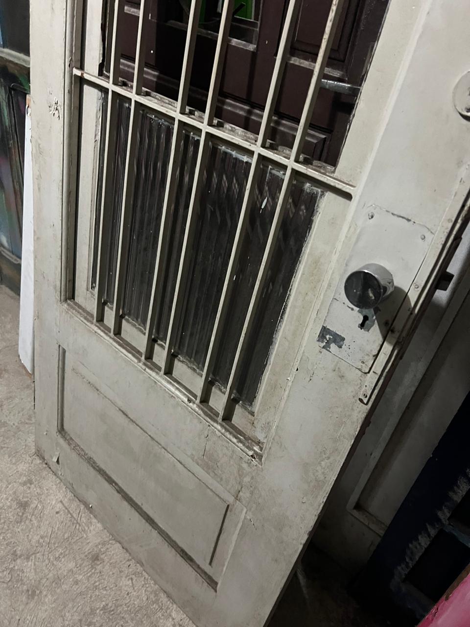 Peça de demolição, sem acabamento, podendo ser restaurada. Possui postigo grande com grade de ferro, vidro canelado.