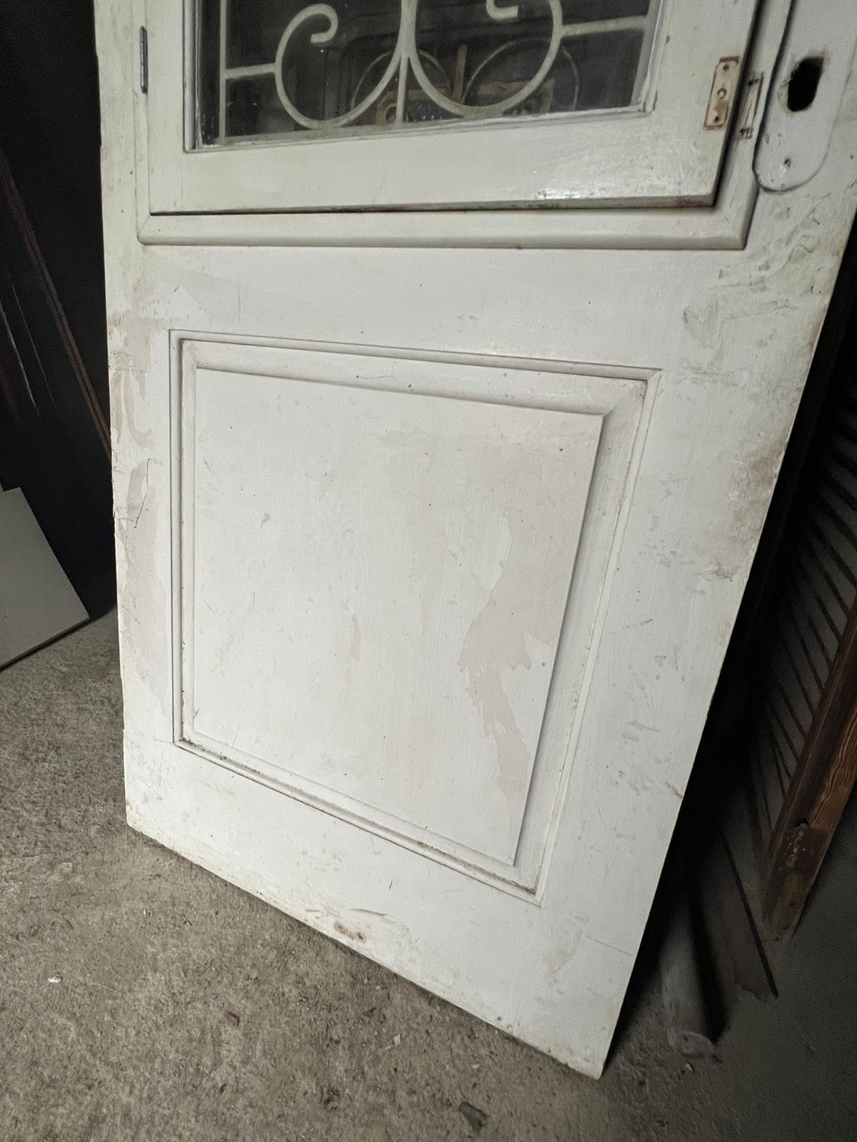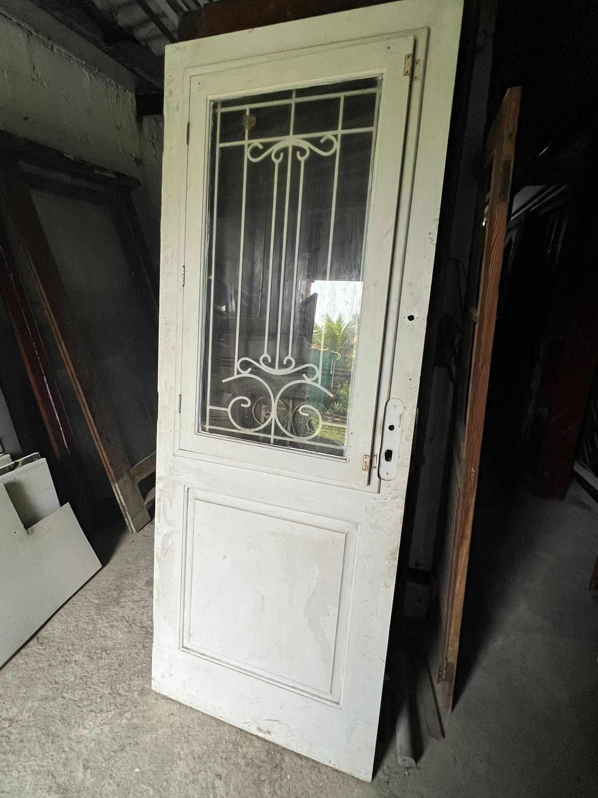 Feita de madeira maciça, sem acabamento, na cor branca. Possui postigo com vidro e grade de ferro ornamentada.