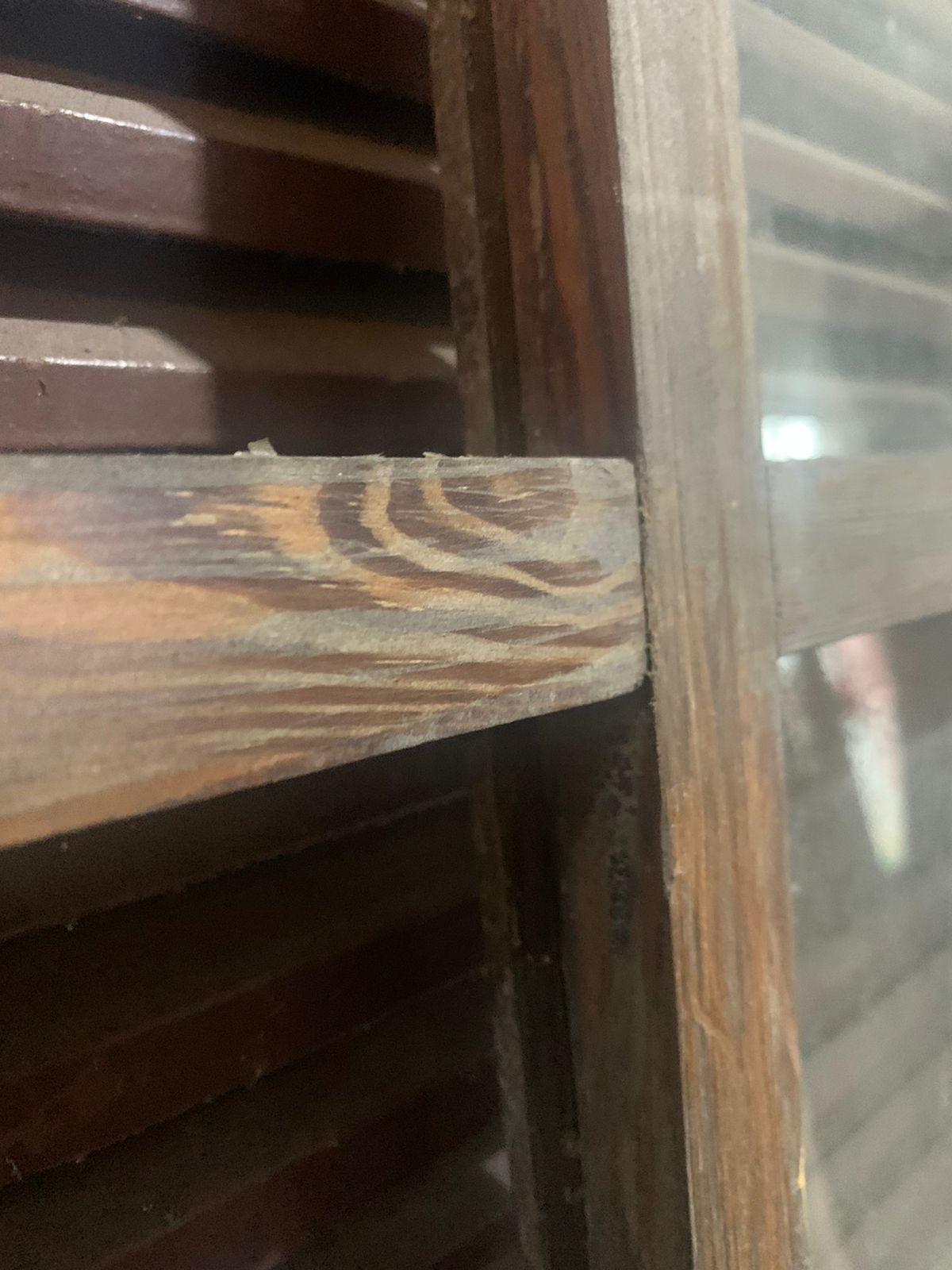 Feita de madeira de pinho de riga, com alguns vidros faltando.