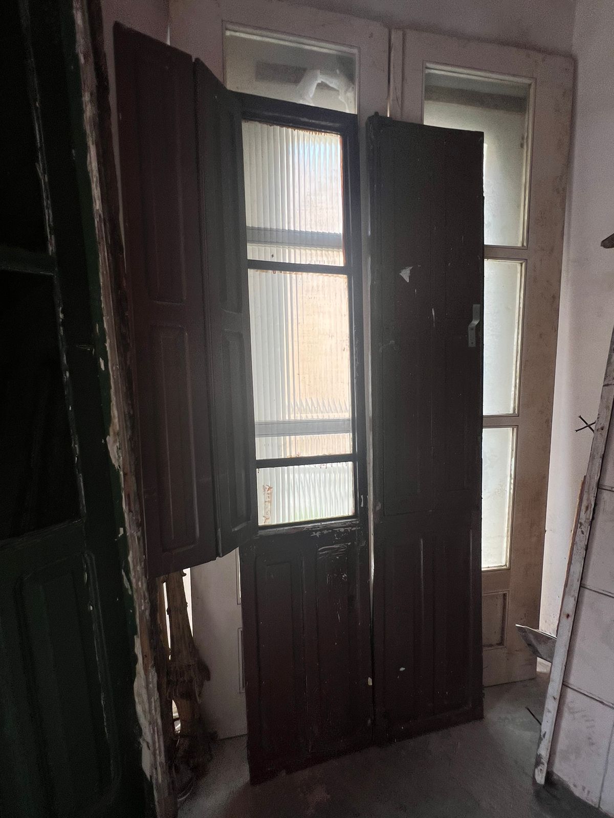 Peça de demolição, feita de madeira maciça, sem acabamento. Possui detalhes de almofadas, postigo cego e 6 vidros canelados.