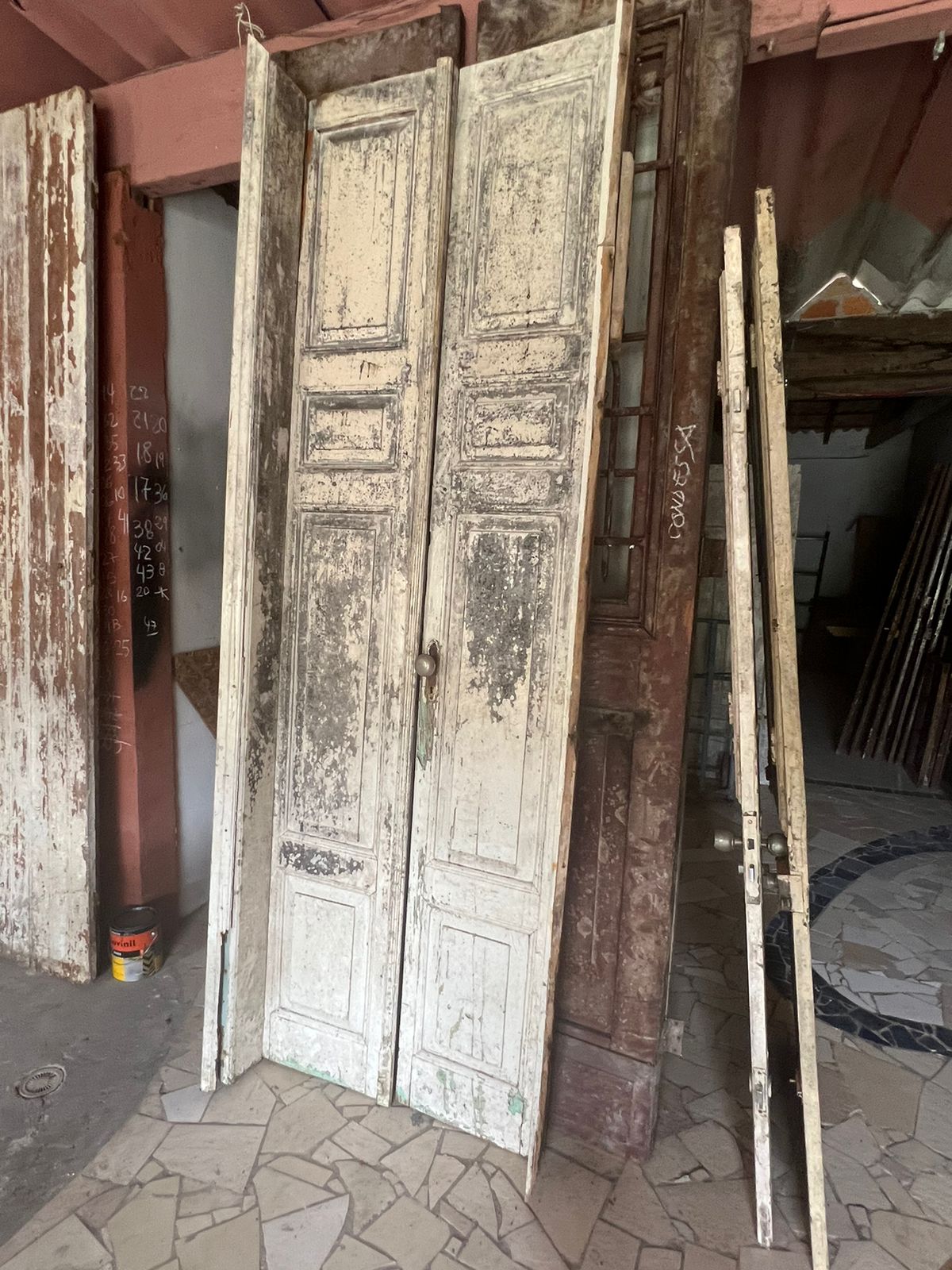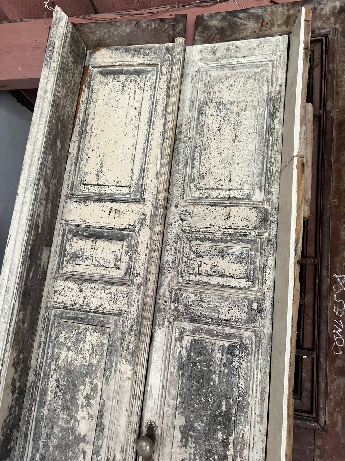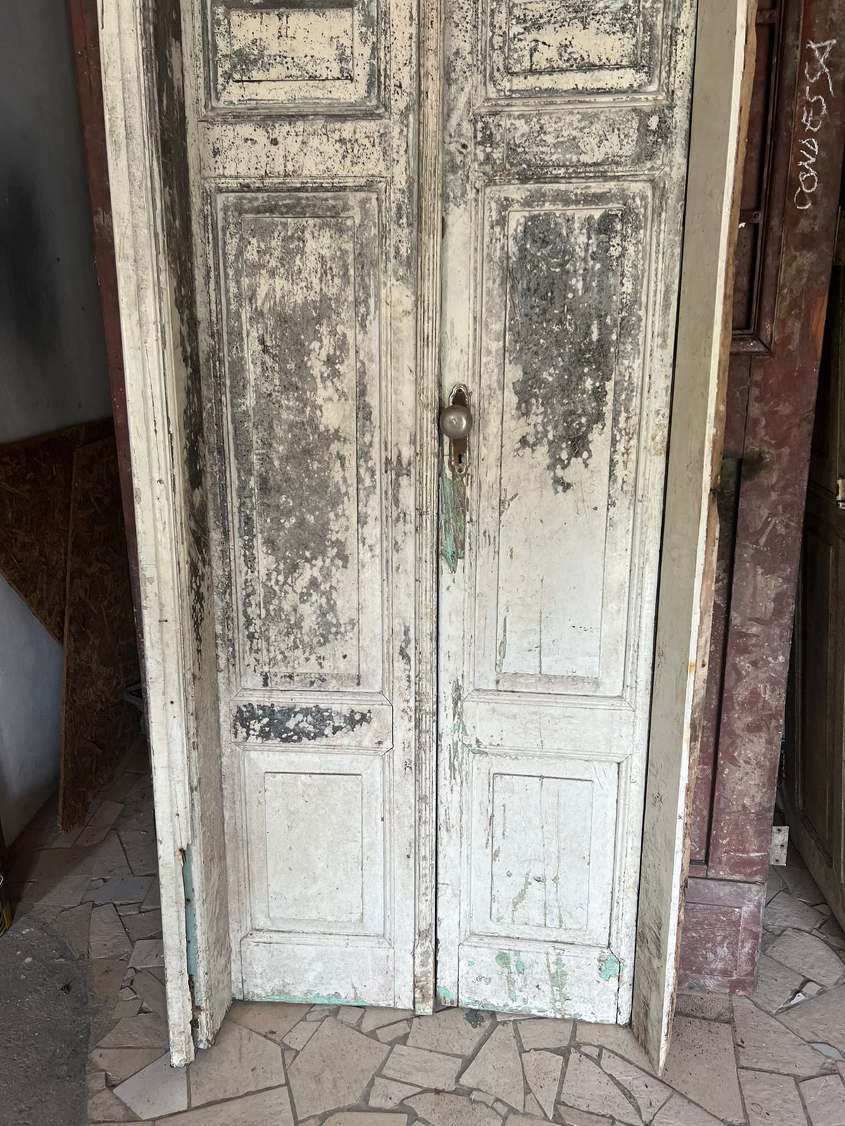 Peça de demolição, sem acabamento. Podendo ser restaurada. Possui detalhes de almofadas com molduradas sobrepostas.
