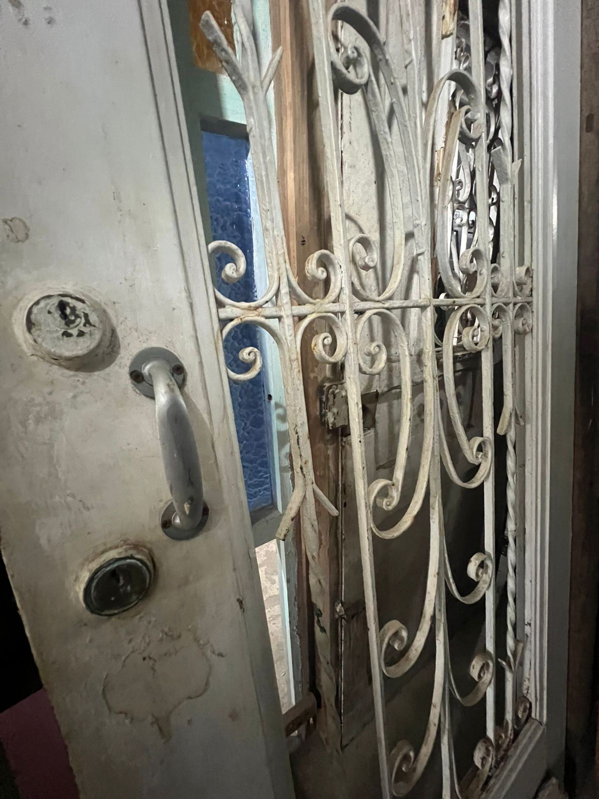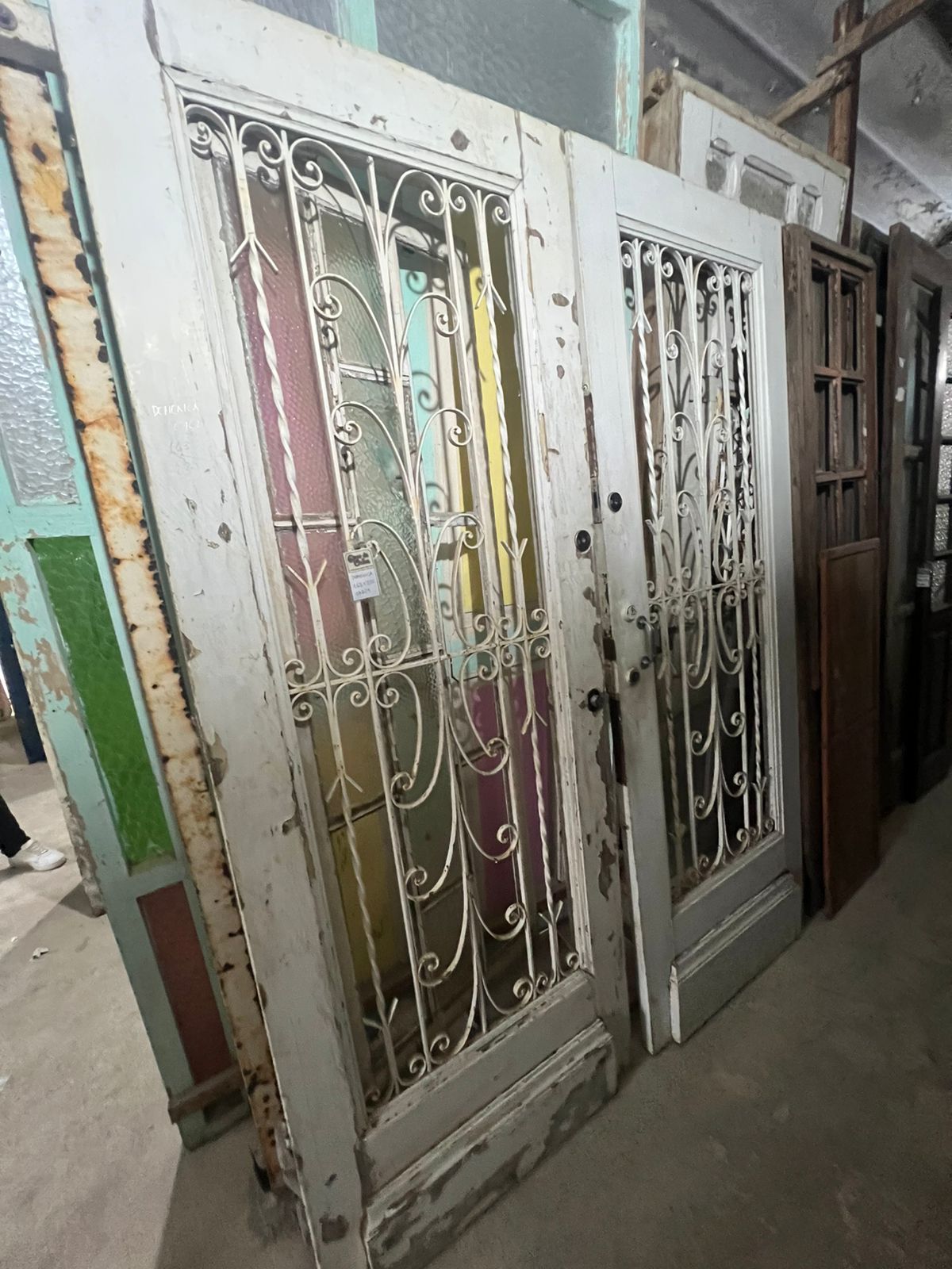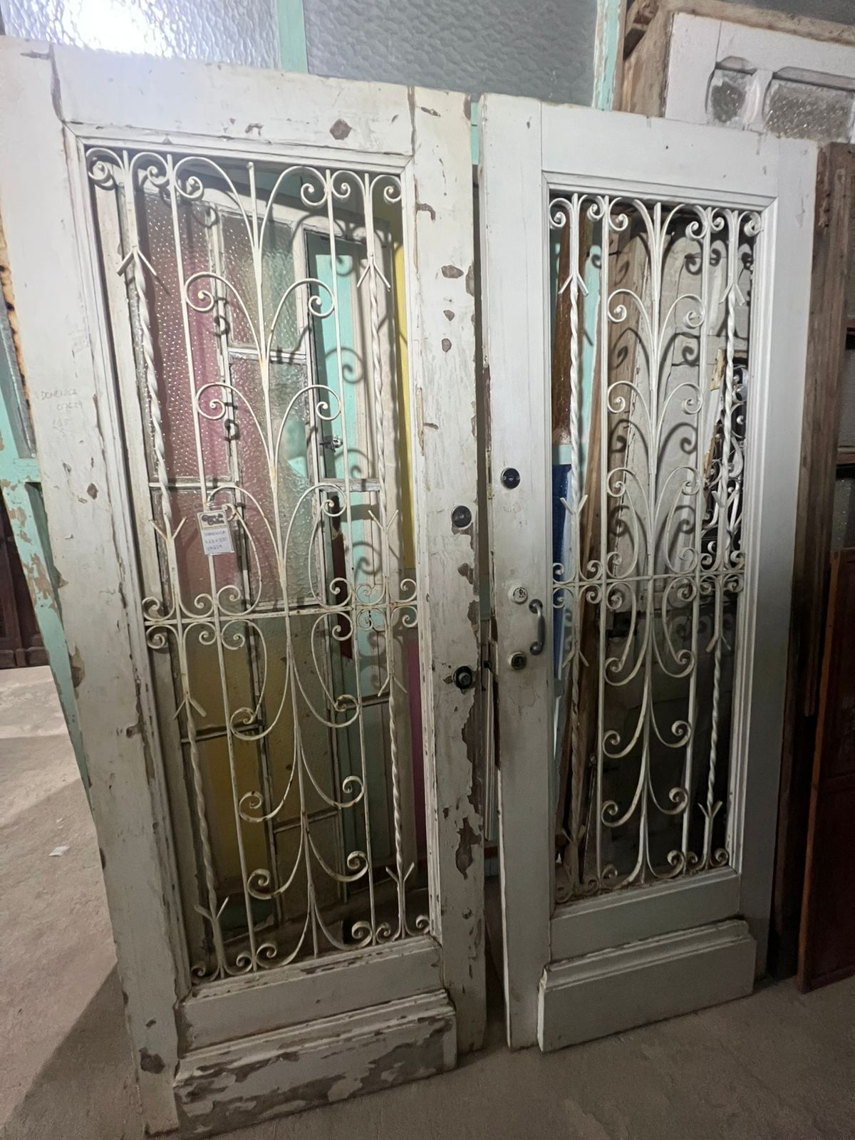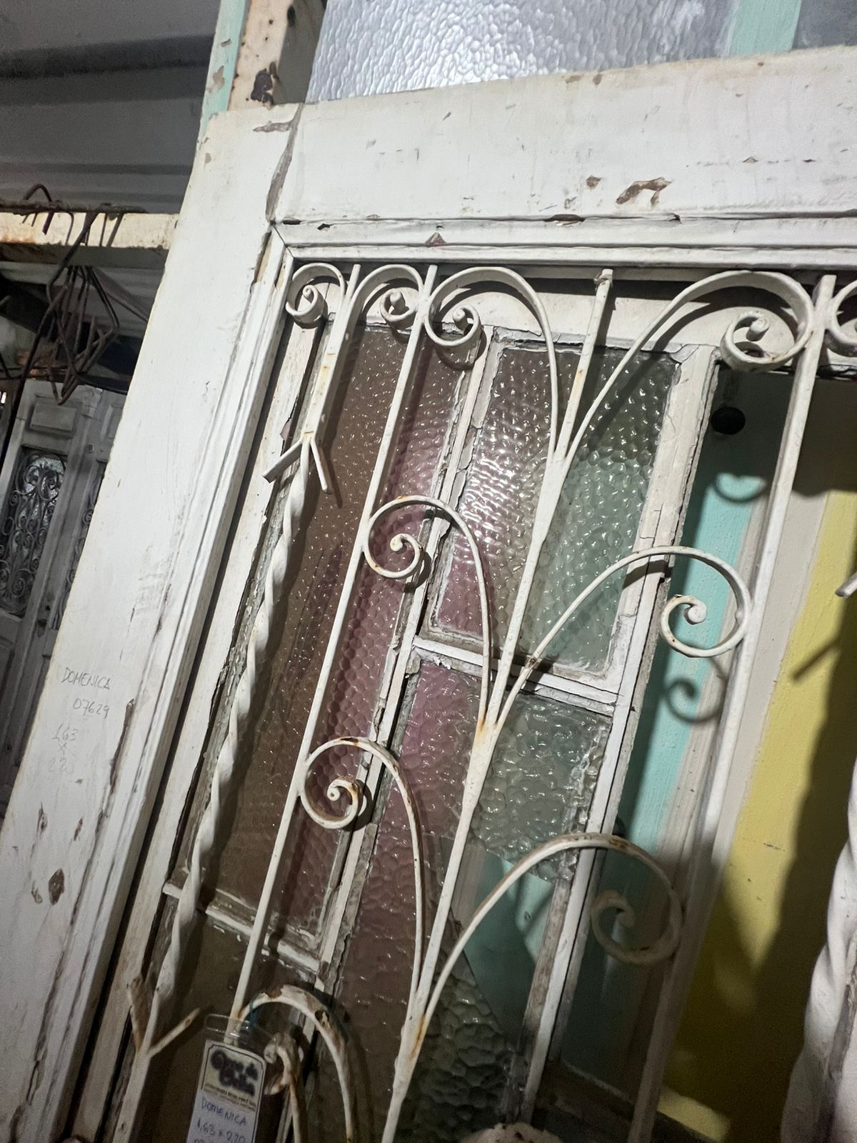 Porta de madeira maciça de demolição, peça sem acabamento, com grande grade de ferro ornamentado e postigo envidraçado. Ideal para restauração.