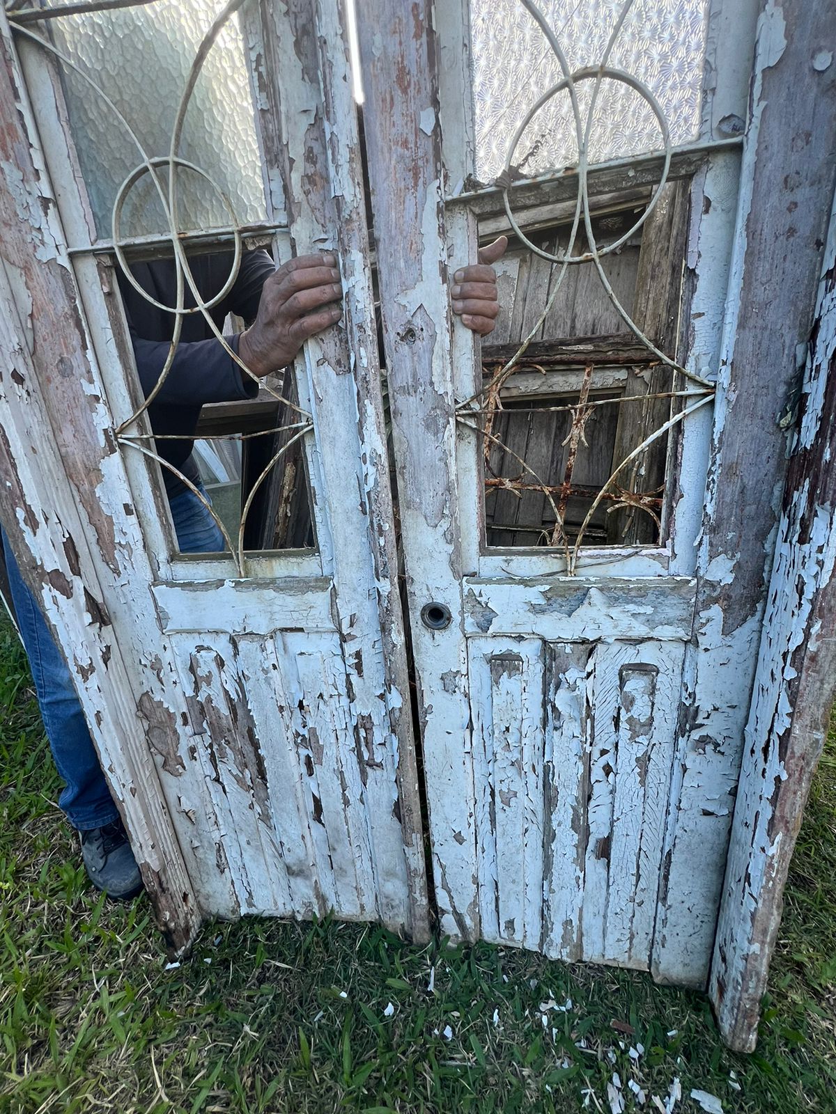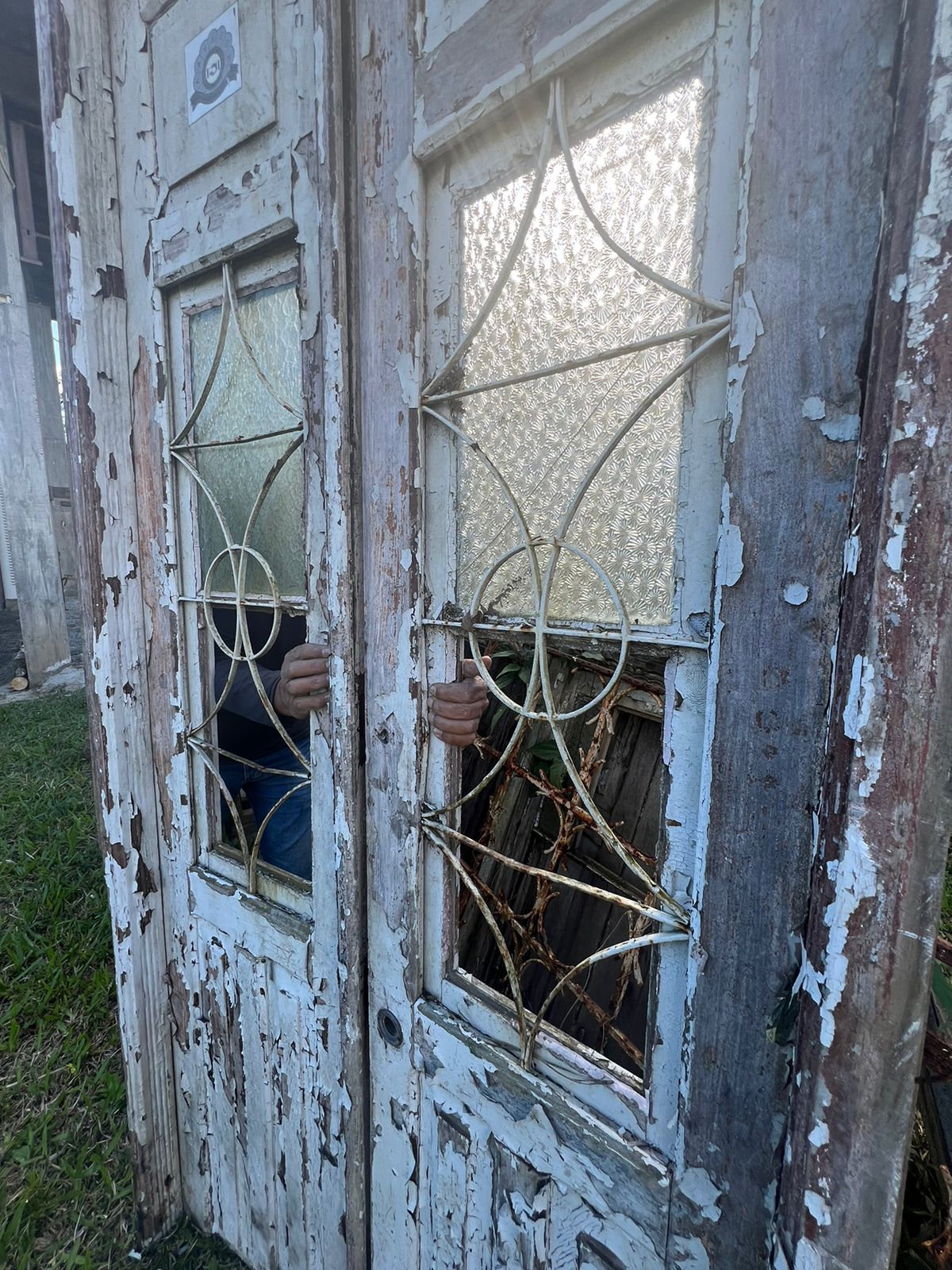 Peça antiga, de demolição, sem acabamento. Feita de madeira maciça, possui postigo com grade de ferro, almofadas e batente.