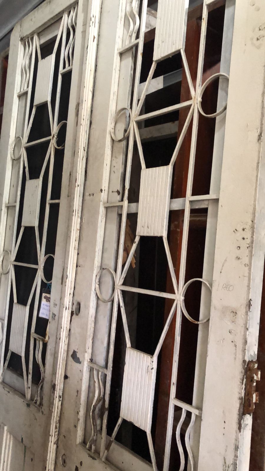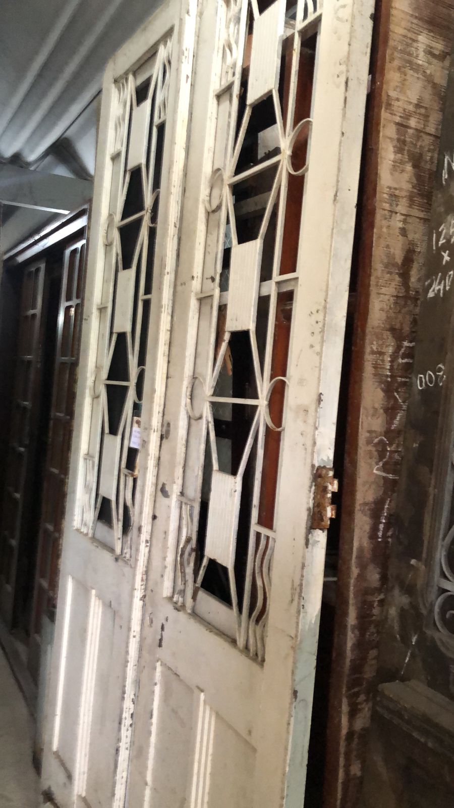 Porta de madeira maciça de demolição, peça sem acabamento, com postigo envidraçado e grade de ferro em formatos geométricos. Ideal para restauração.
