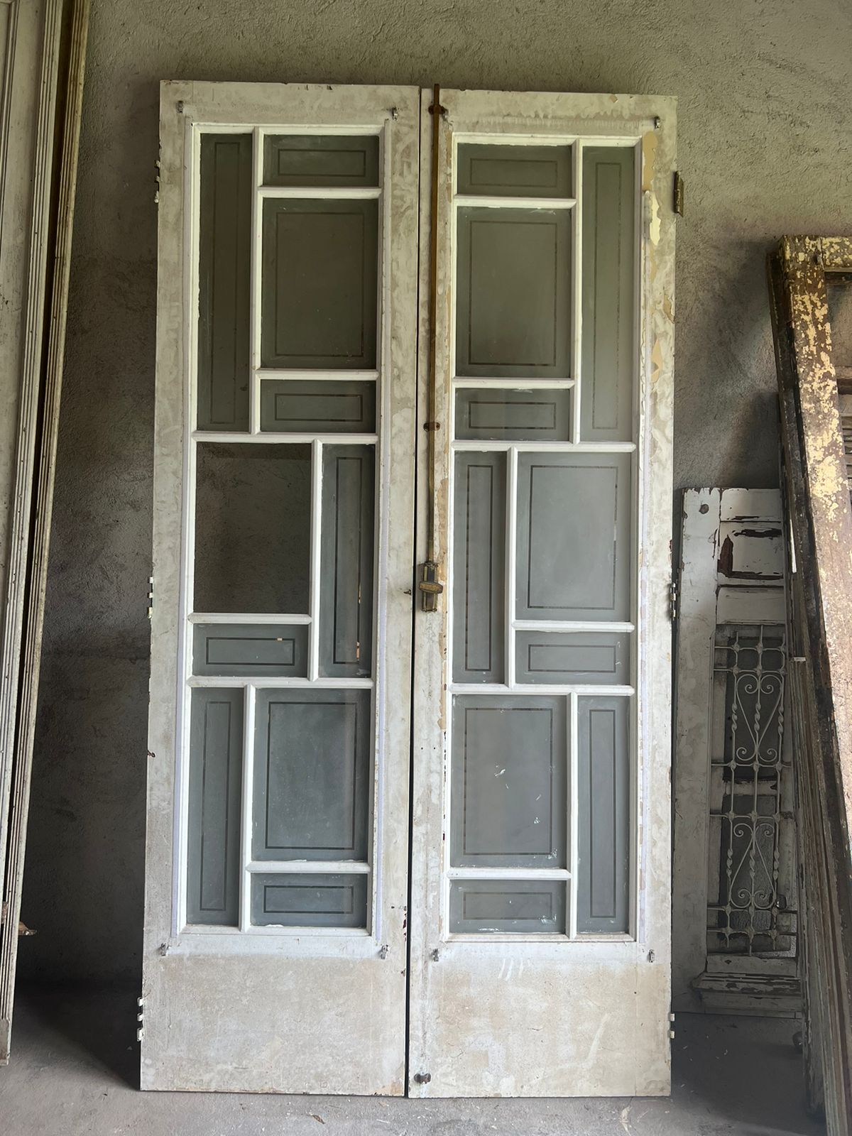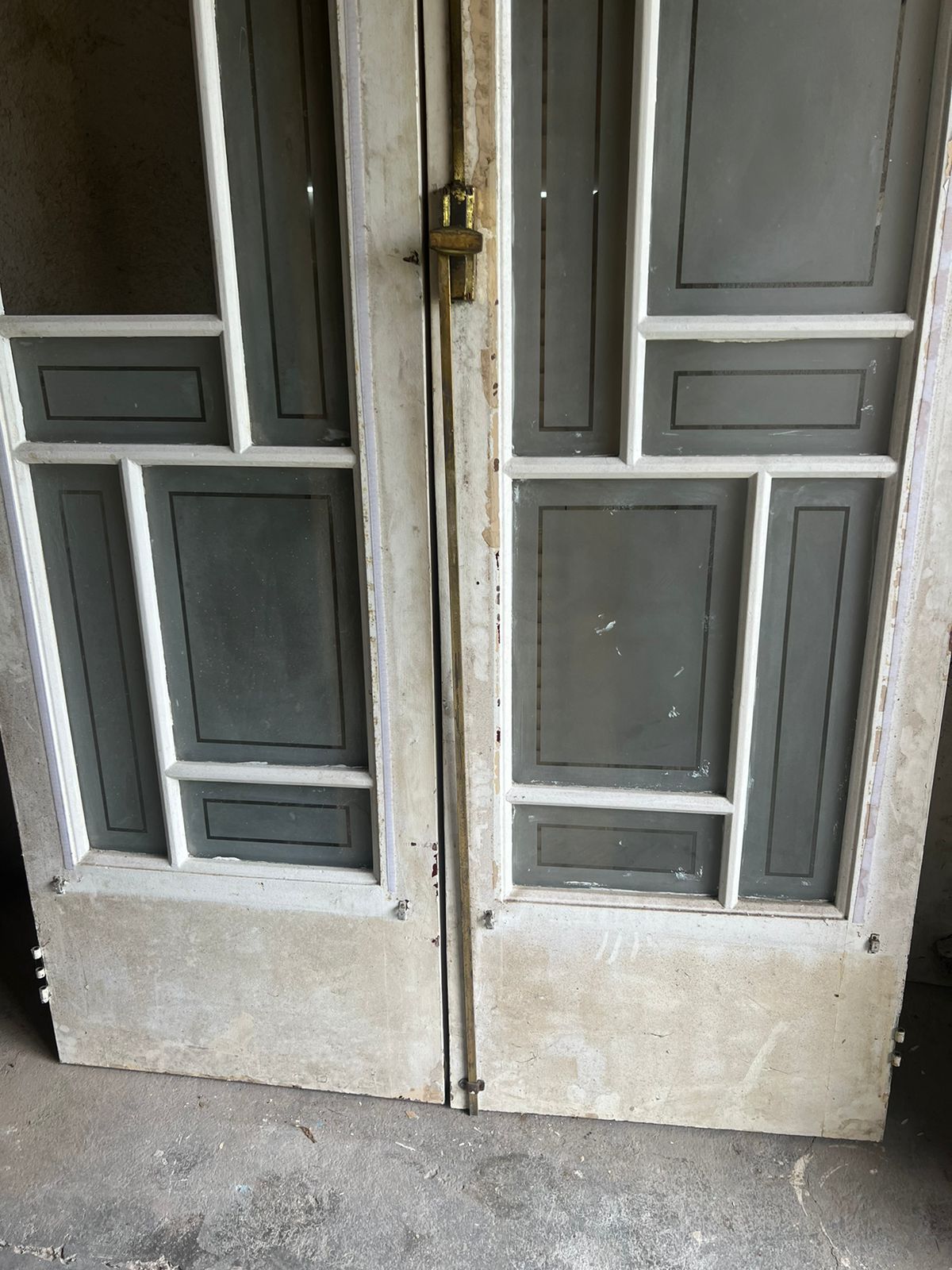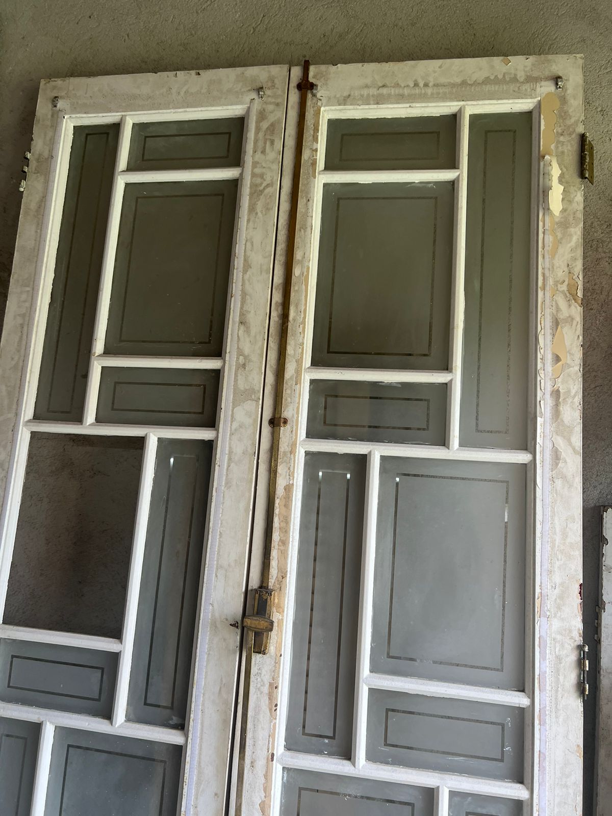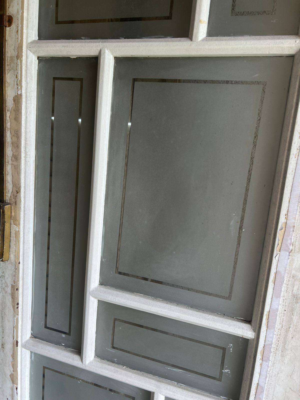 Peça antiga, feito de madeira maciça, sem acabamento. Possui vidros jateados incolor.