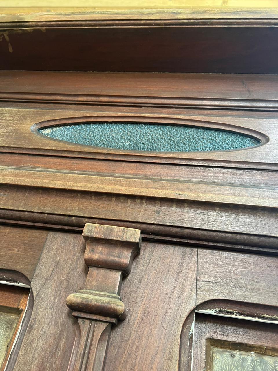 Peça antiga, de demolição, sem acabamento. Com grades e postigo com vidros, Possui bandeira superior com vidro oval. Acompanha de maçanetas antigas e batente.