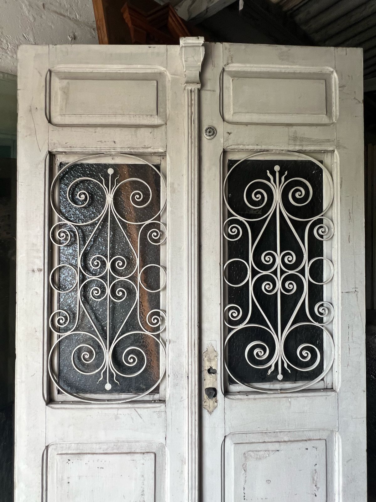 Porta de madeira maciça de demolição, peça sem acabamento, com postigo envidraçado e grades de ferro ornamentadas. Possui detalhes em madeira entalhada e almofadas na parte superior e inferior,