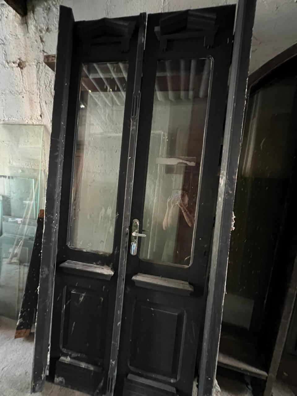 Porta antiga de madeira maciça de demolição, com detalhes em madeira entalhada e apliques decorativos. Possui vidros incolores de grandes dimensões.