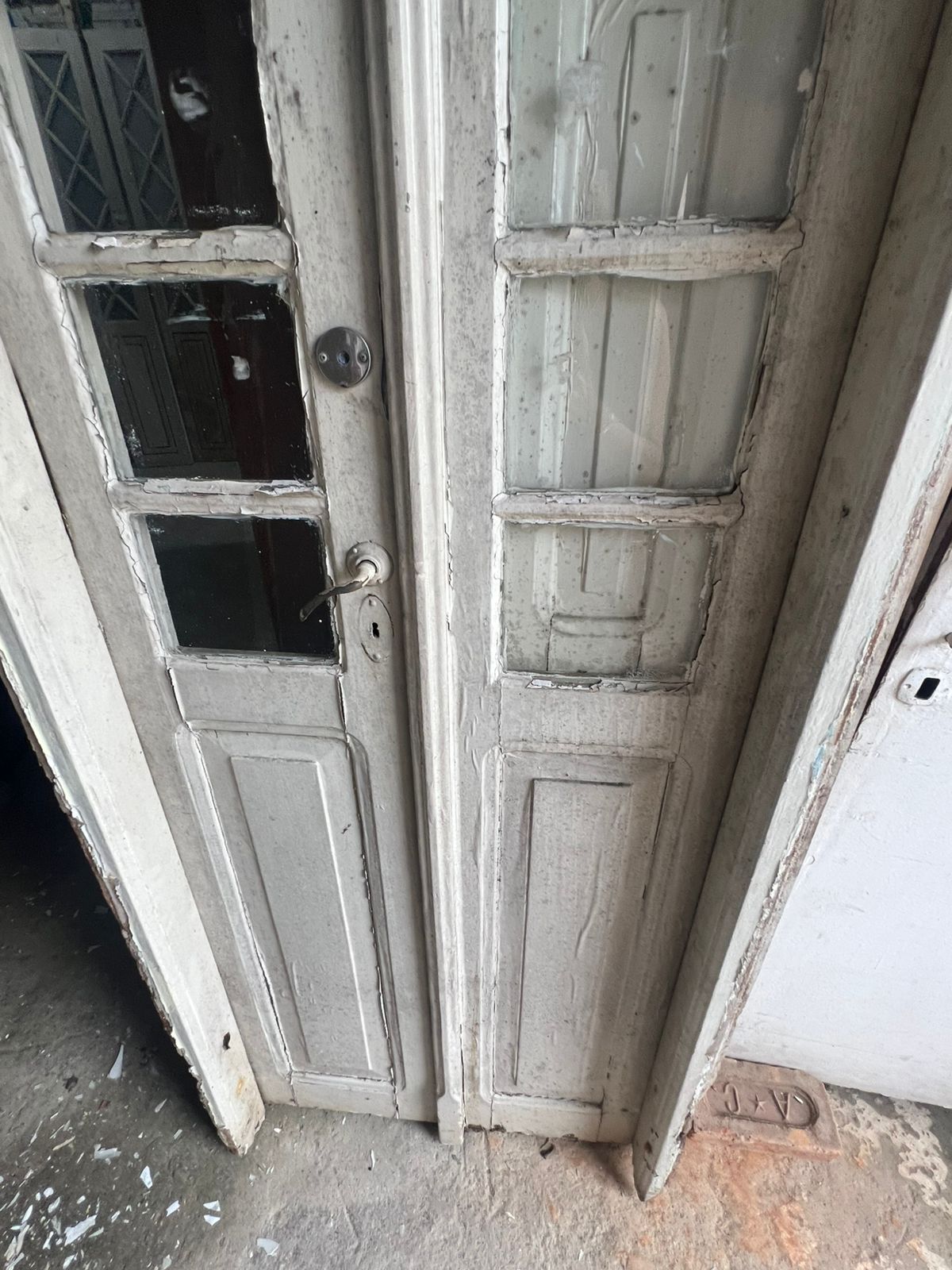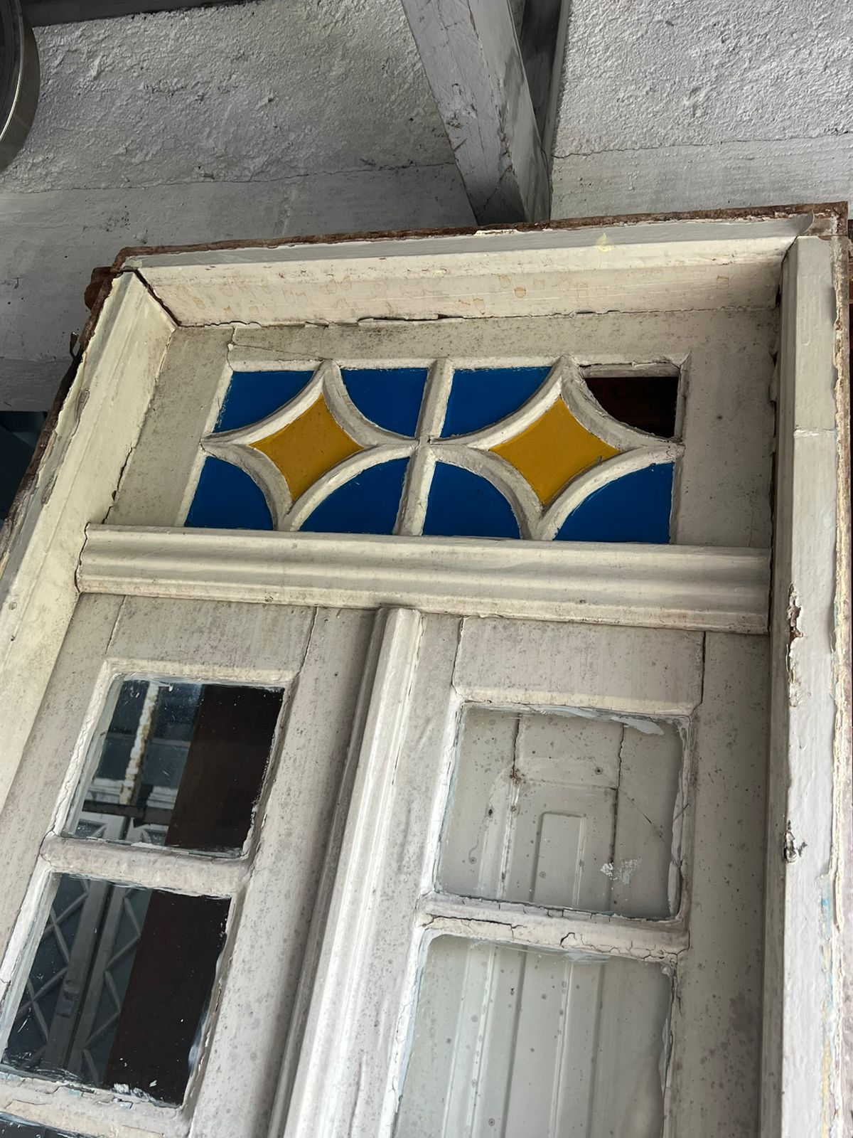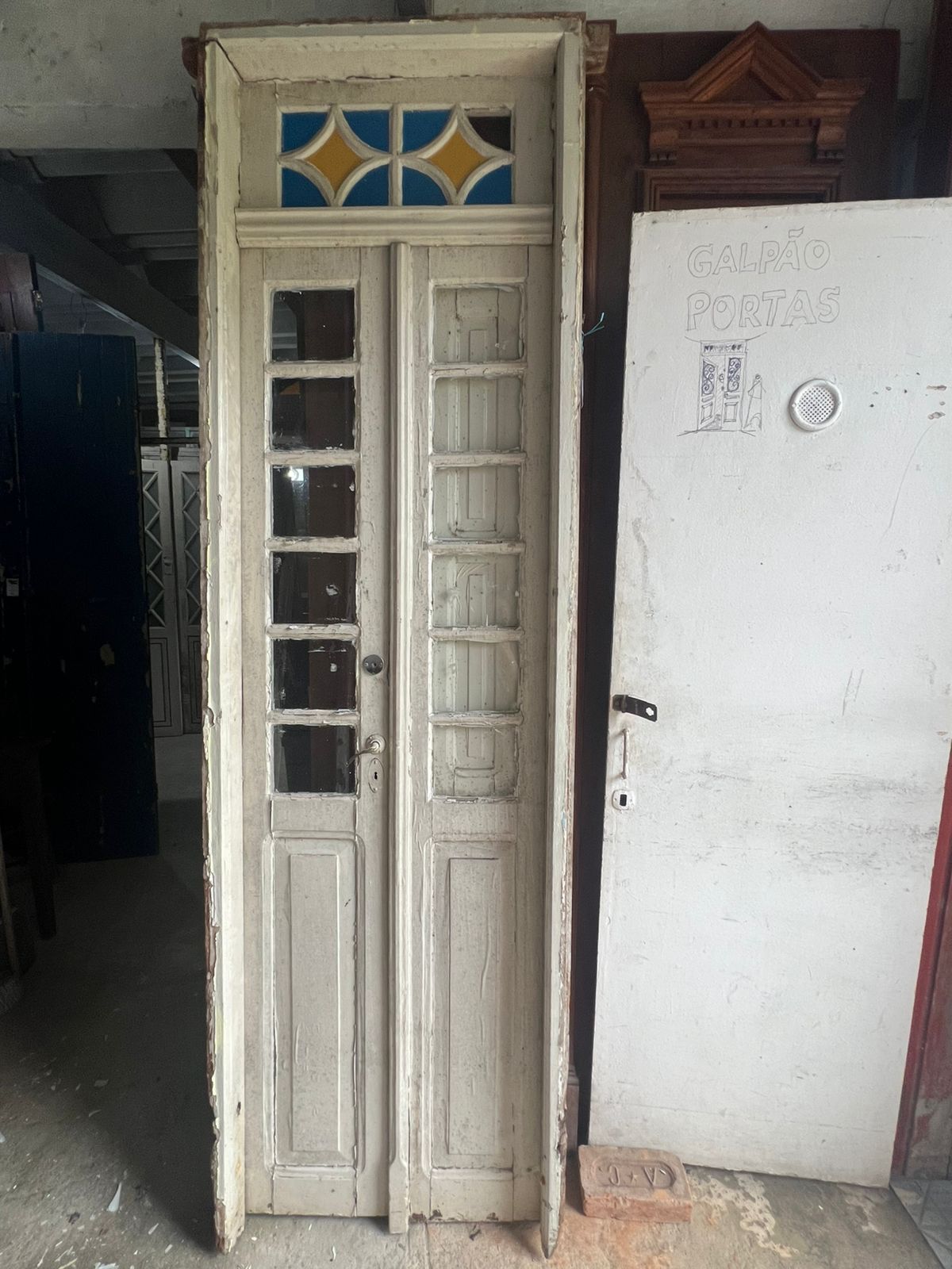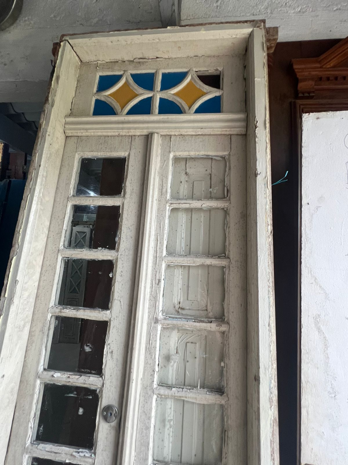 Porta de madeira maciça de demolição, peça sem acabamento, com pequenos vidros nas folhas e bandeira superior com vidros coloridos.