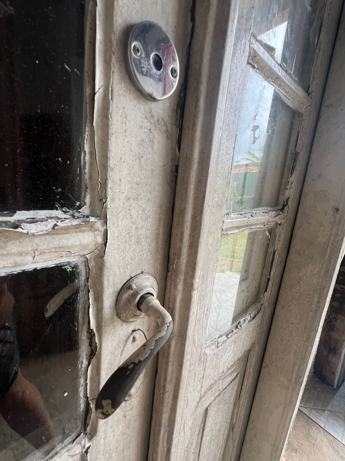 Porta dupla estreita com bandeira superior.
