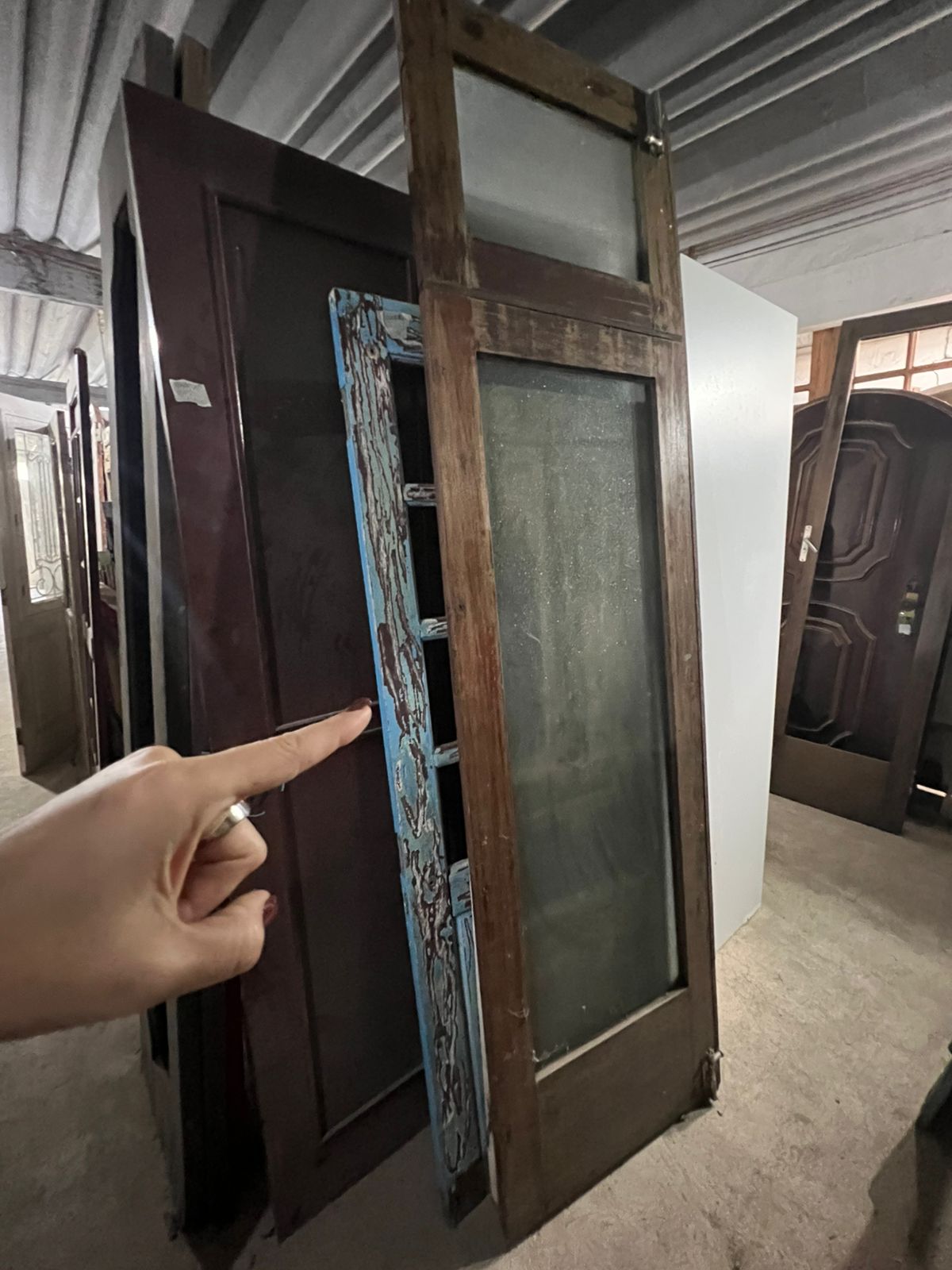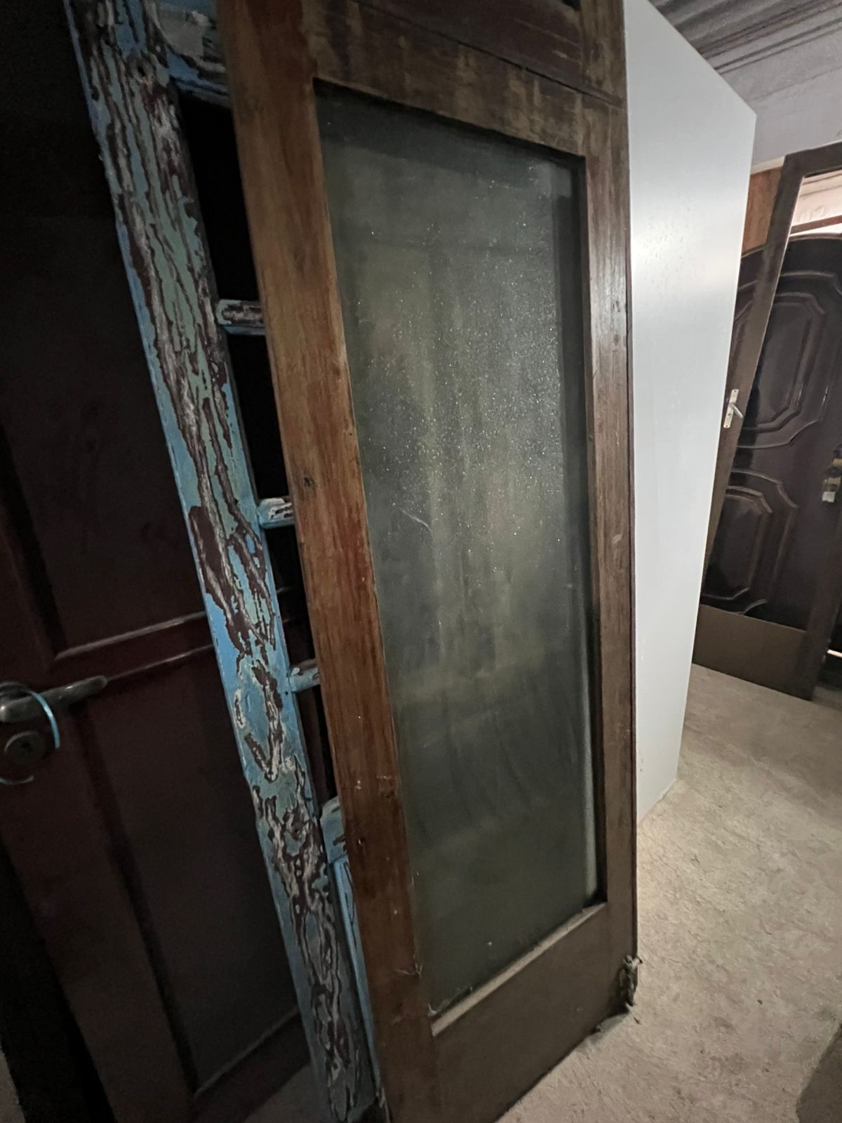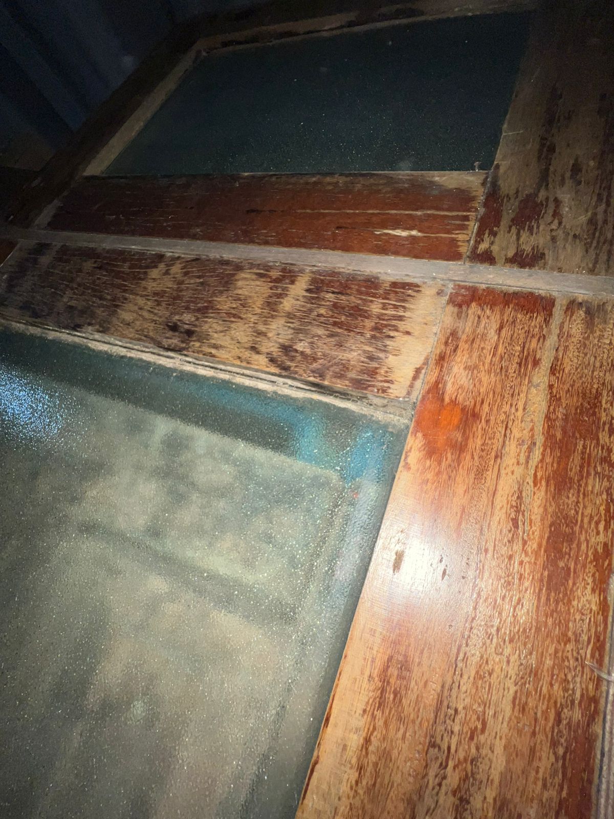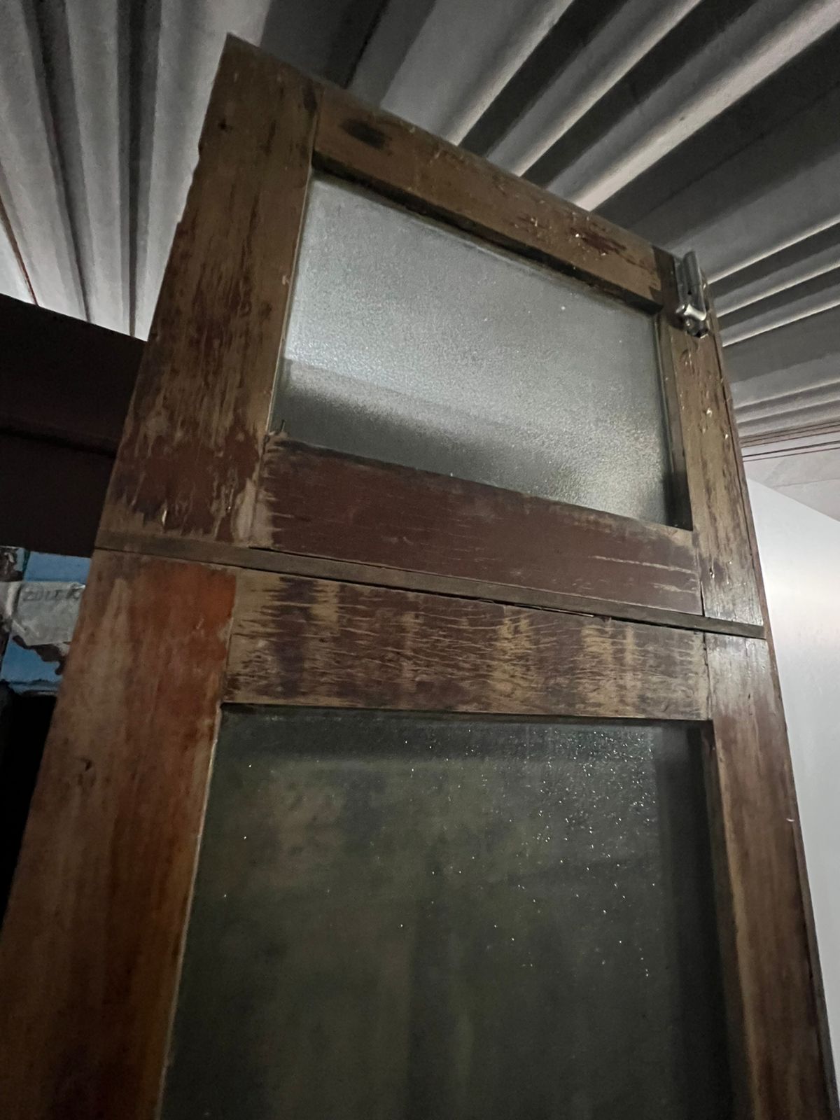 Feito de madeira maciça de demolição, peça sem acabamento, com amplo espaço para vidro e bandeira superior também com abertura para vidro.