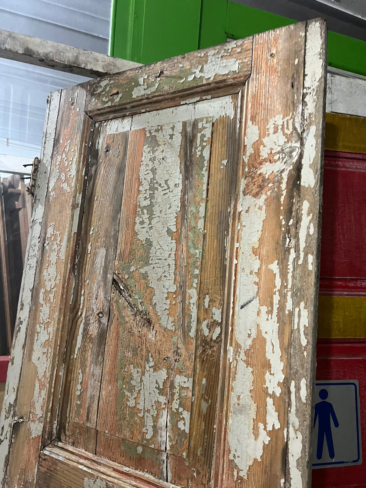 Feito de madeira de pinho de riga, sem acabamento, com pintura descascada.