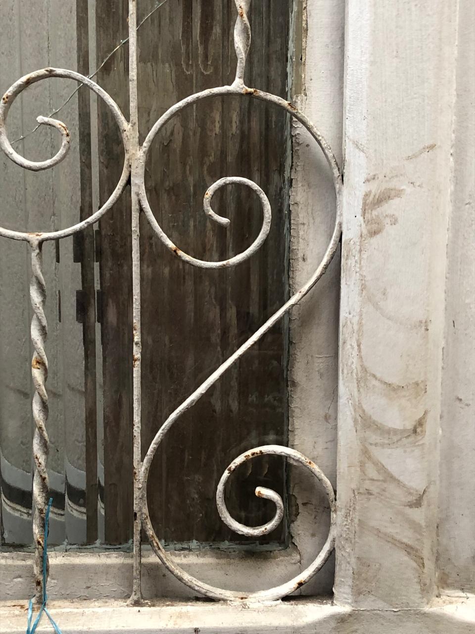 Porta de madeira maciça de demolição, peça sem acabamento, com postigo envidraçado e grade de ferro ornamentada fixa.