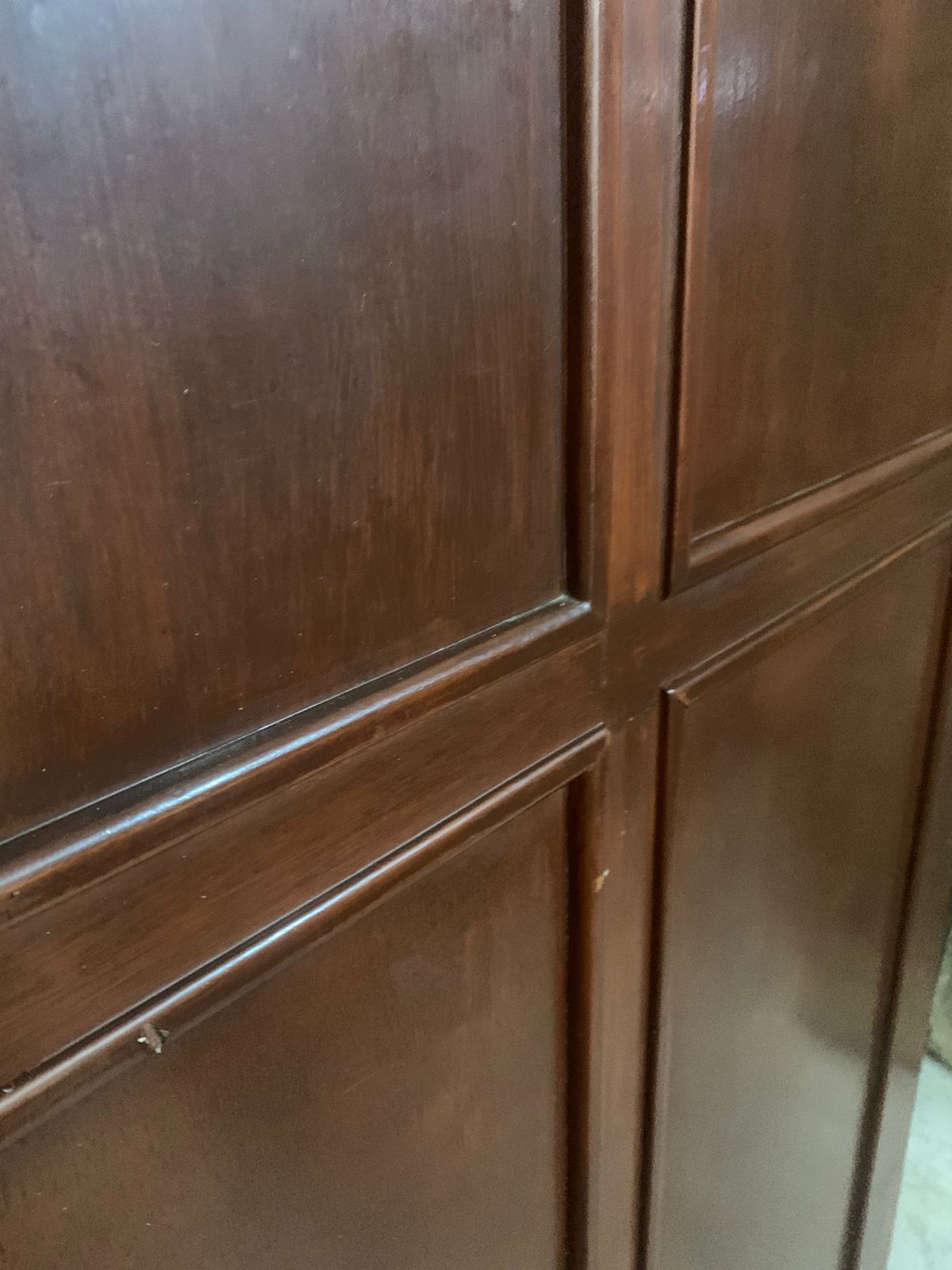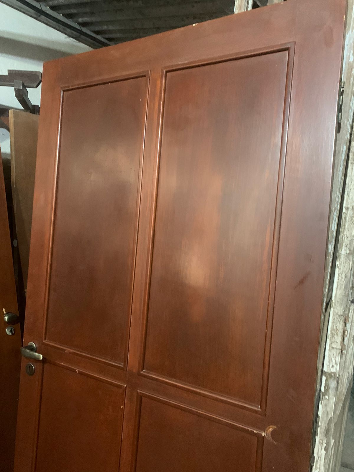 Bem conservada, envernizada, molduras sobrepostas nas duas faces. Possui maçaneta e trincos.