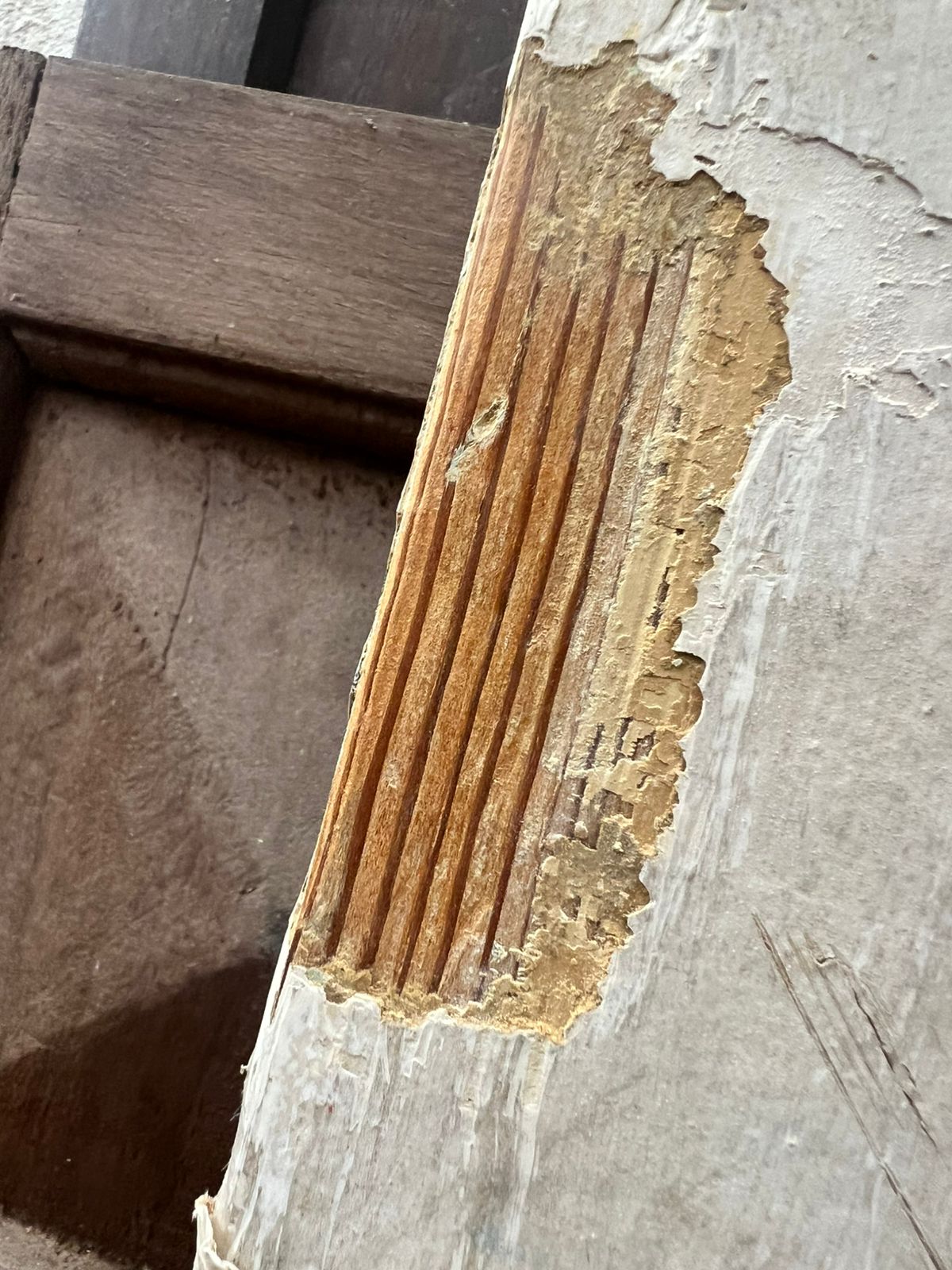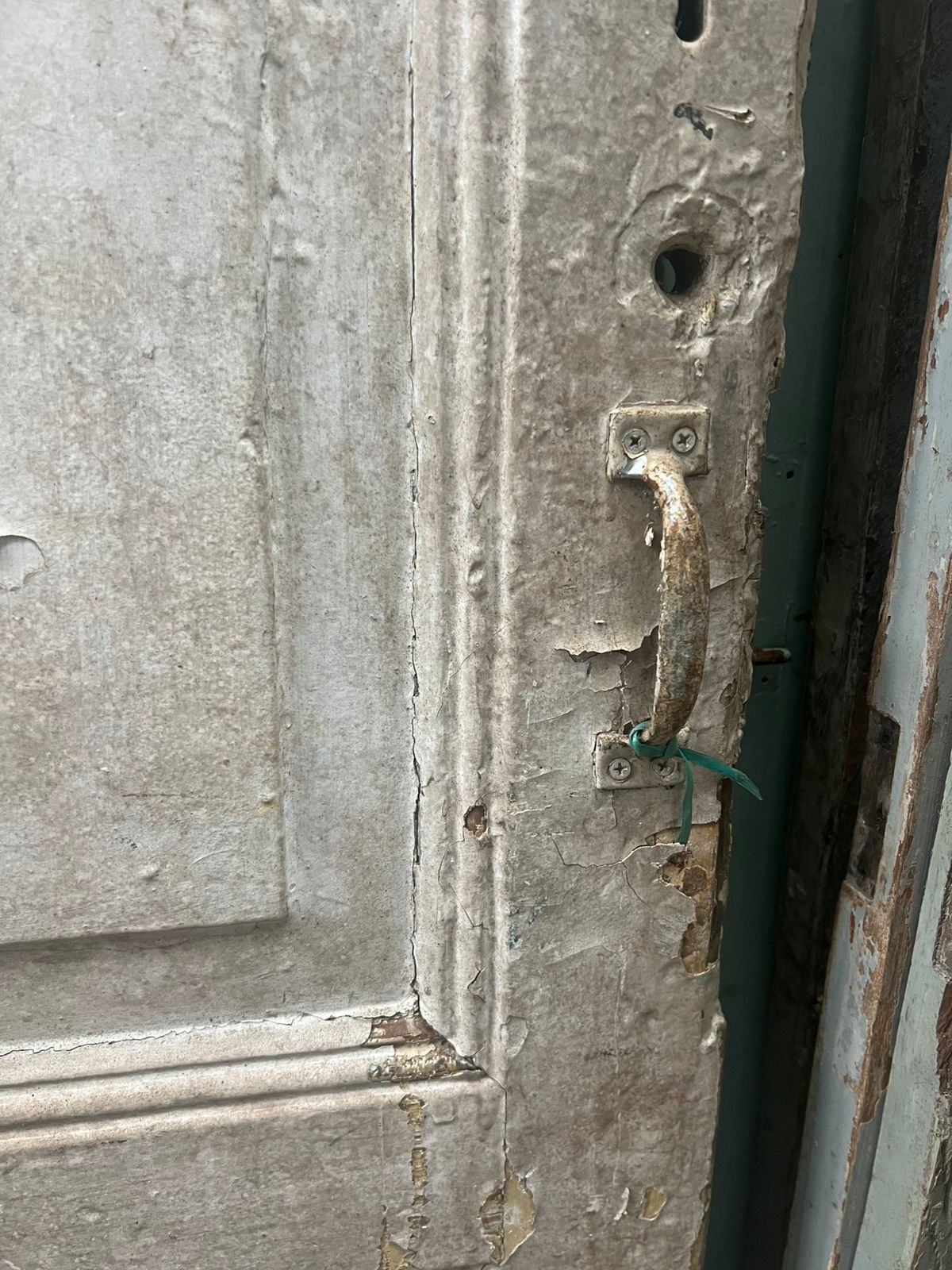 Peça de demolição, sem acabamento. Possui detalhes de almofadas e puxadores de ferro.