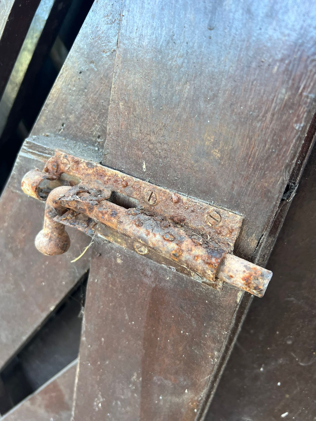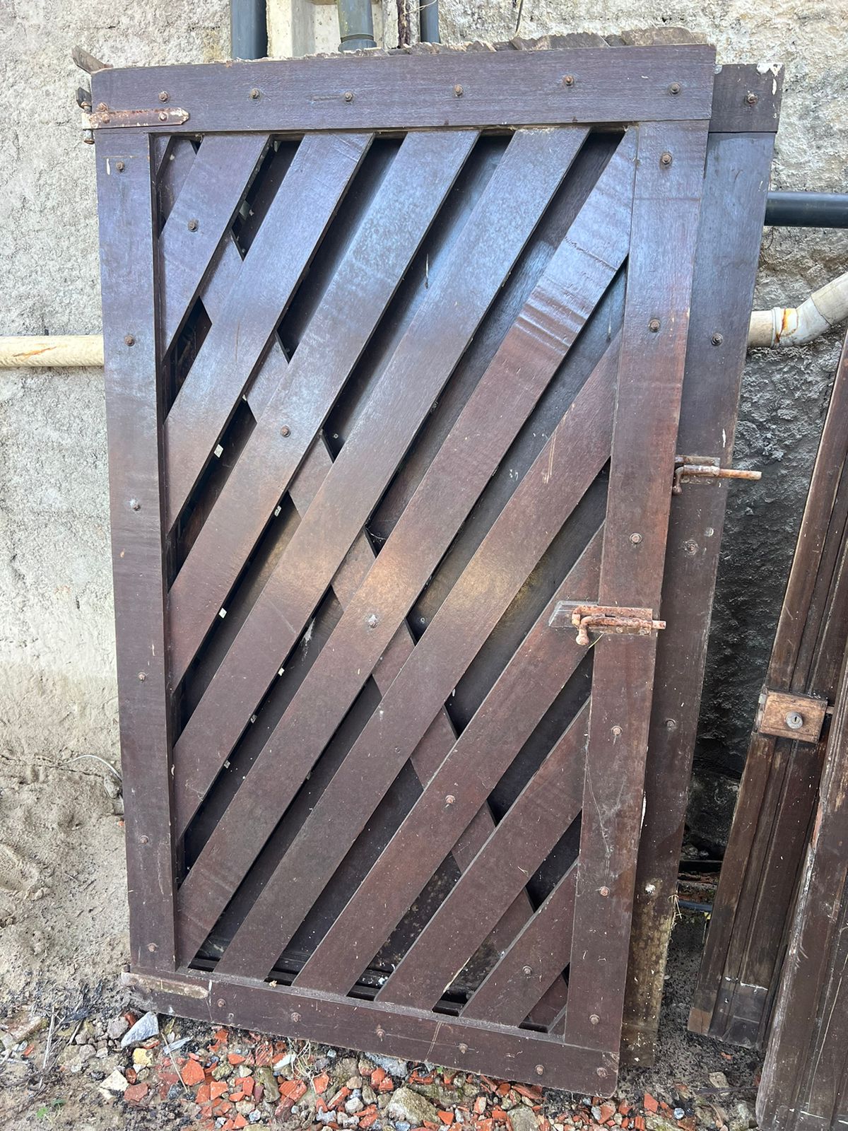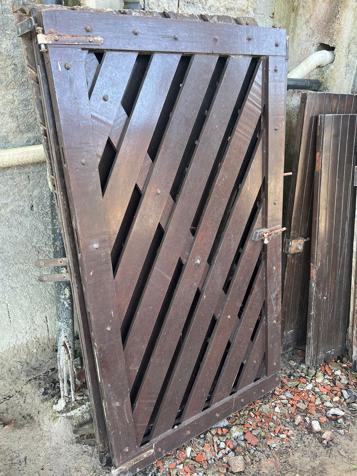 Peça de demolição, sem acabamento, feito de madeira maciça. Possui travessas na diagonal.