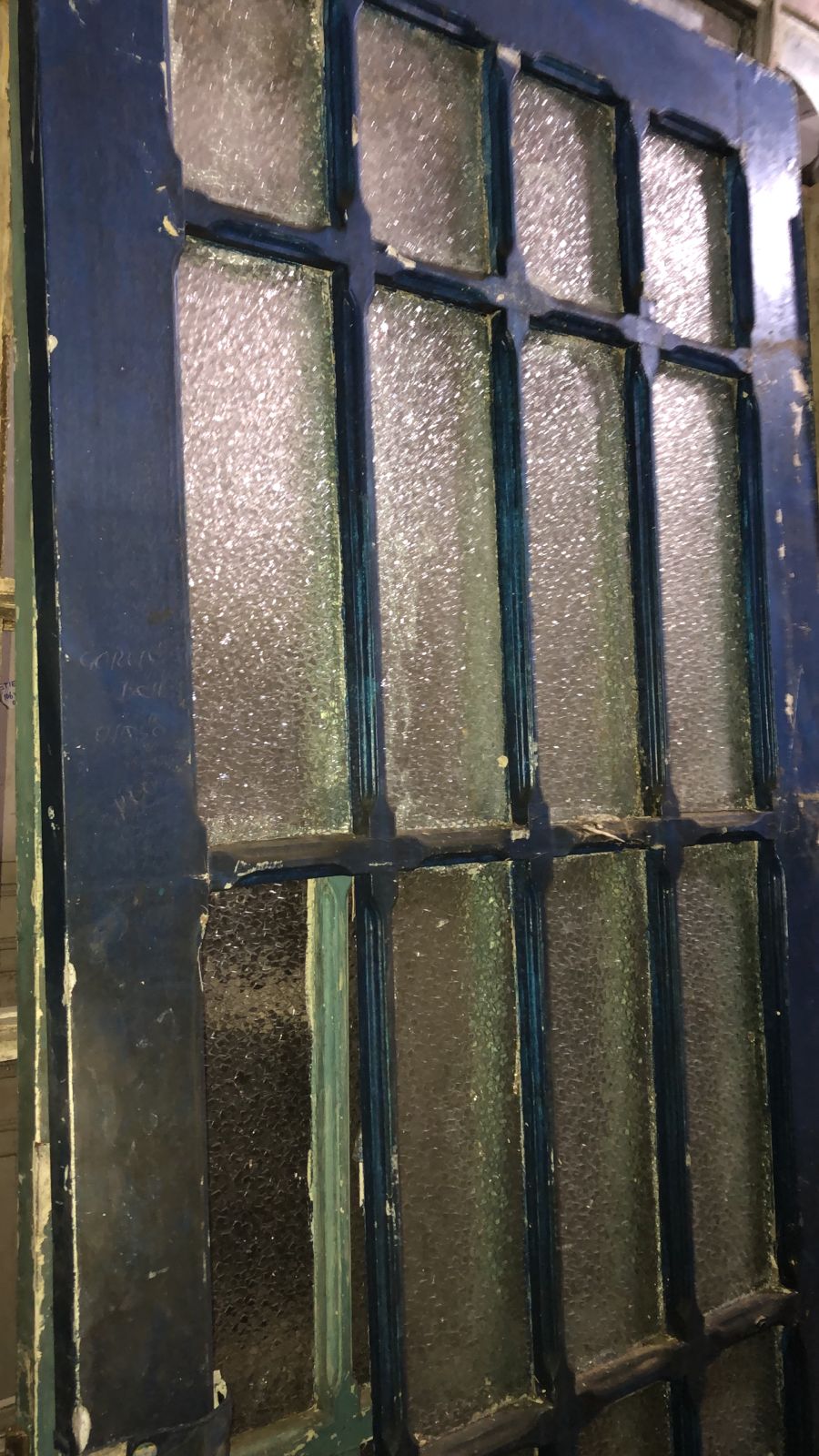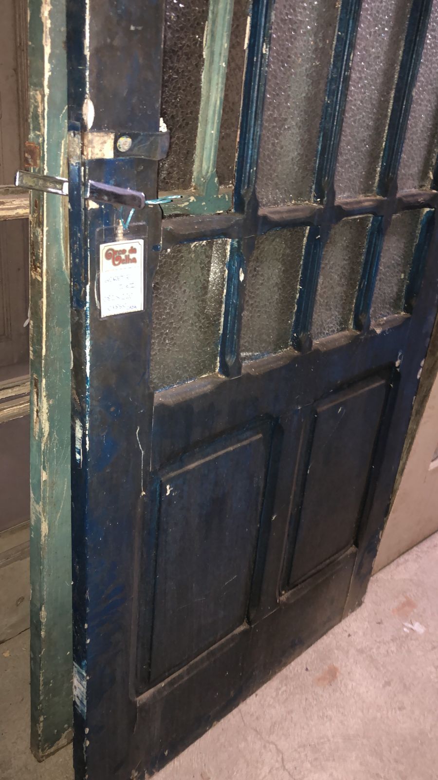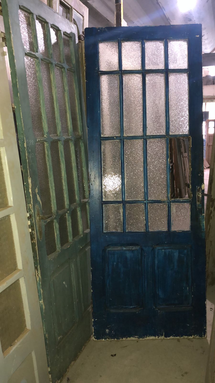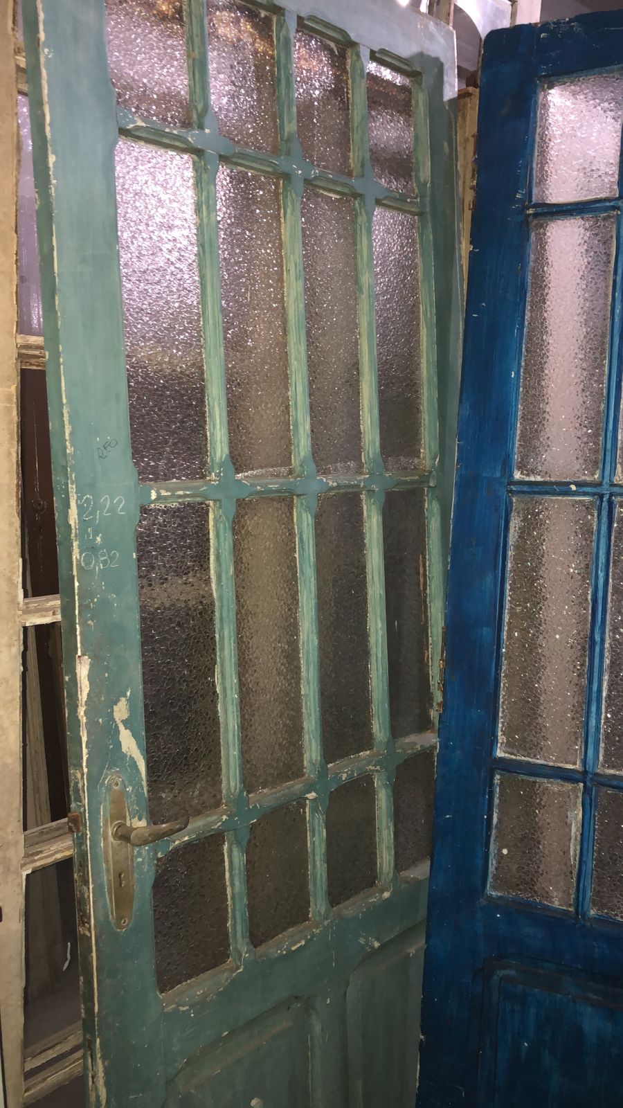 Portas antigas de madeira maciça de demolição, peças sem acabamento, com design semelhante. Ambas possuem detalhes de almofadas na parte inferior e espaço para vidros incolores e texturizados.