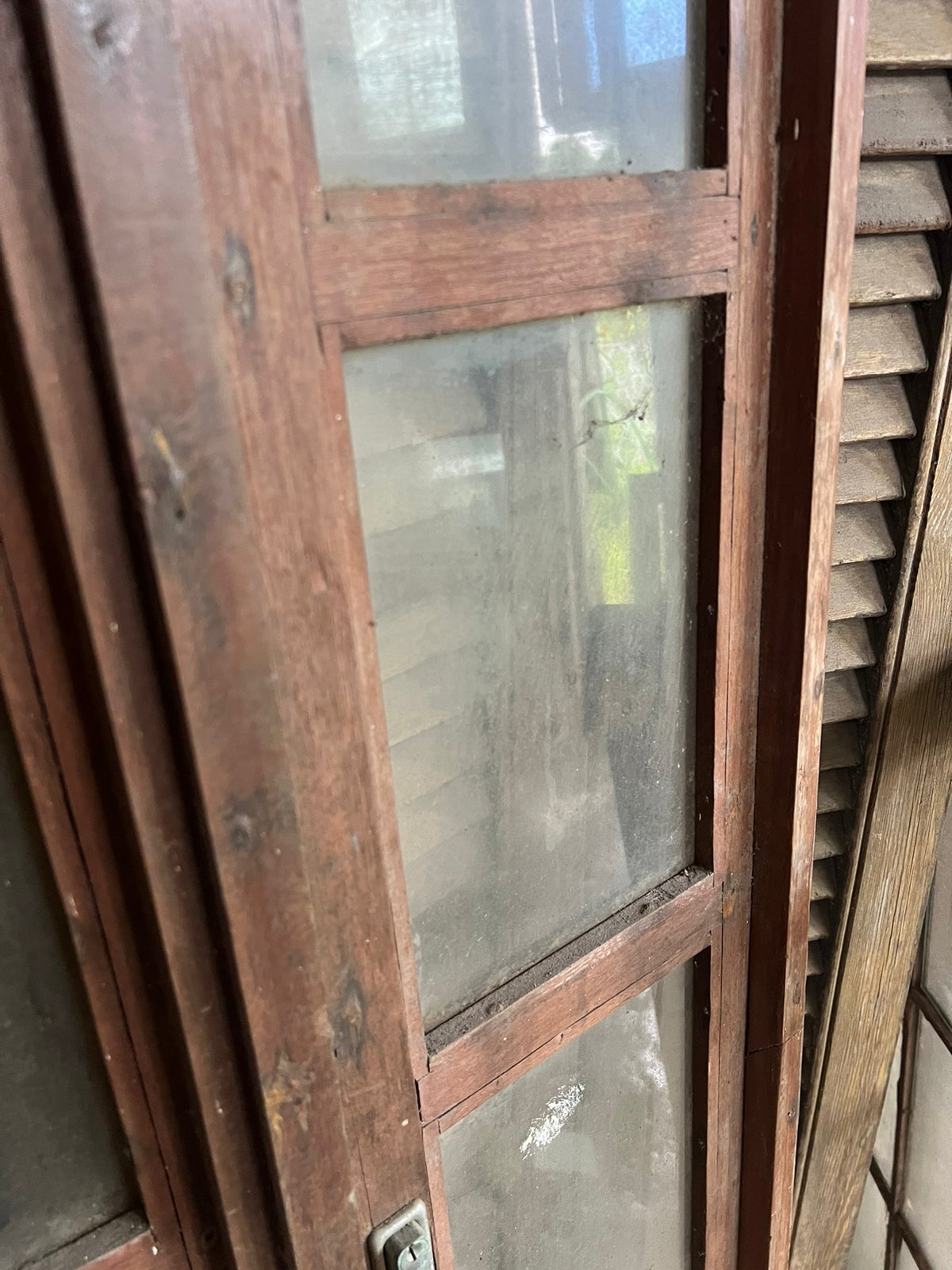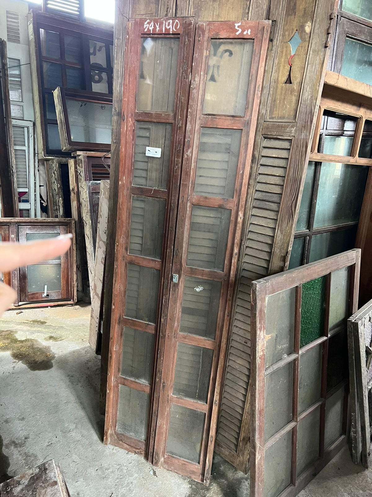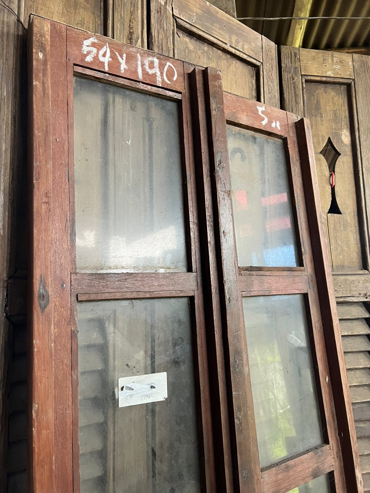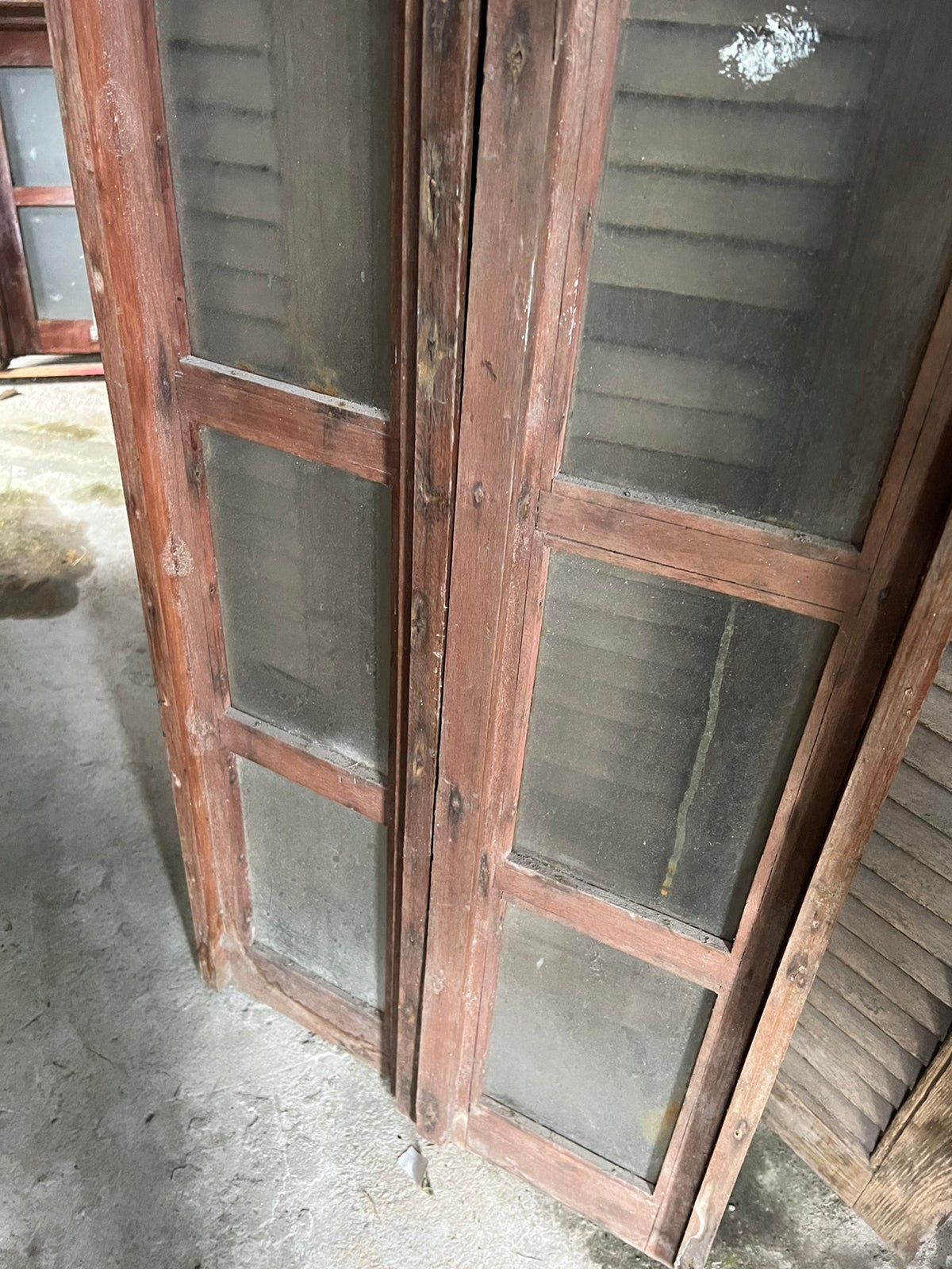 Feita de madeira maciça, sem acabamento. Possui 6 vidros em cada folha.