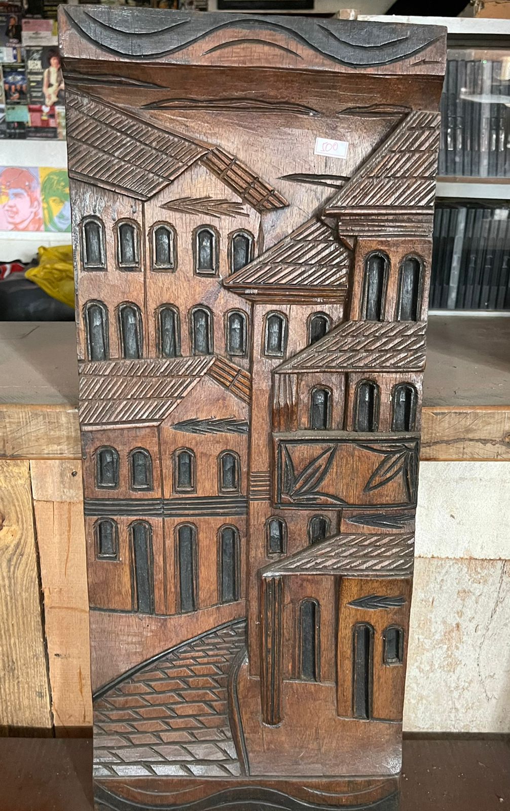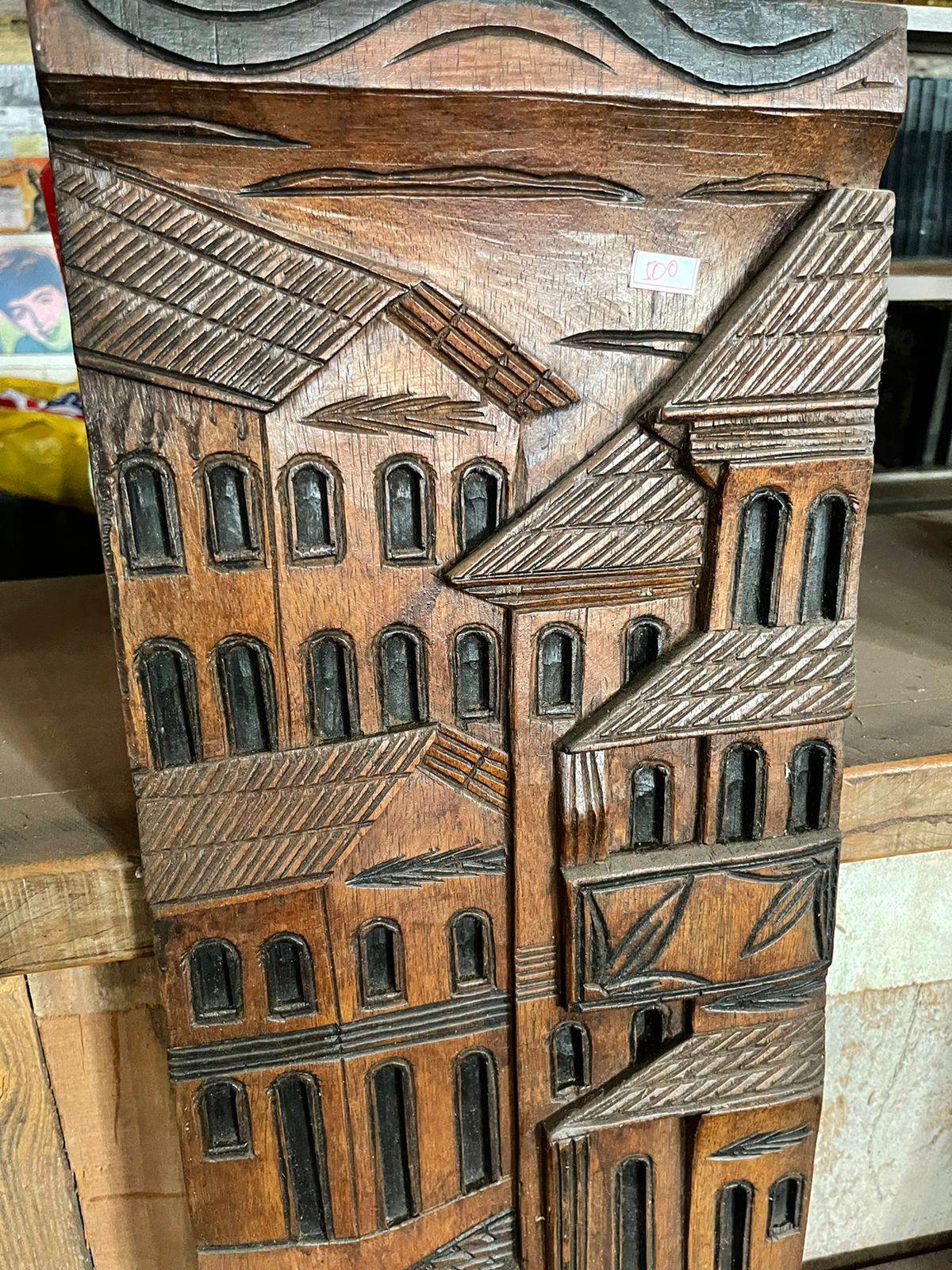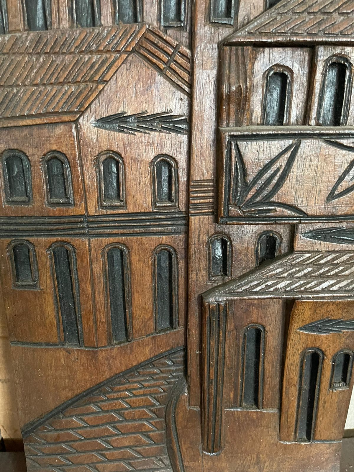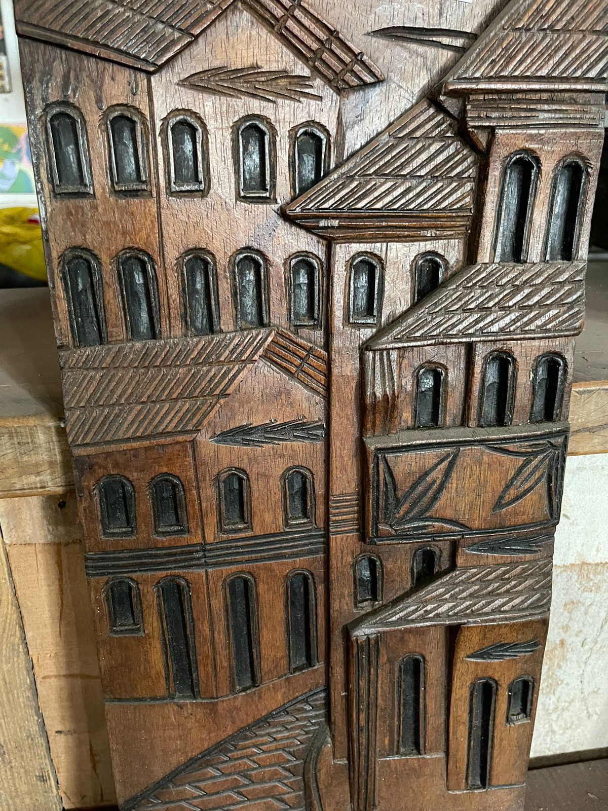 Quadro de madeira entalhada representando a cidade. Rústico e sem pintura.