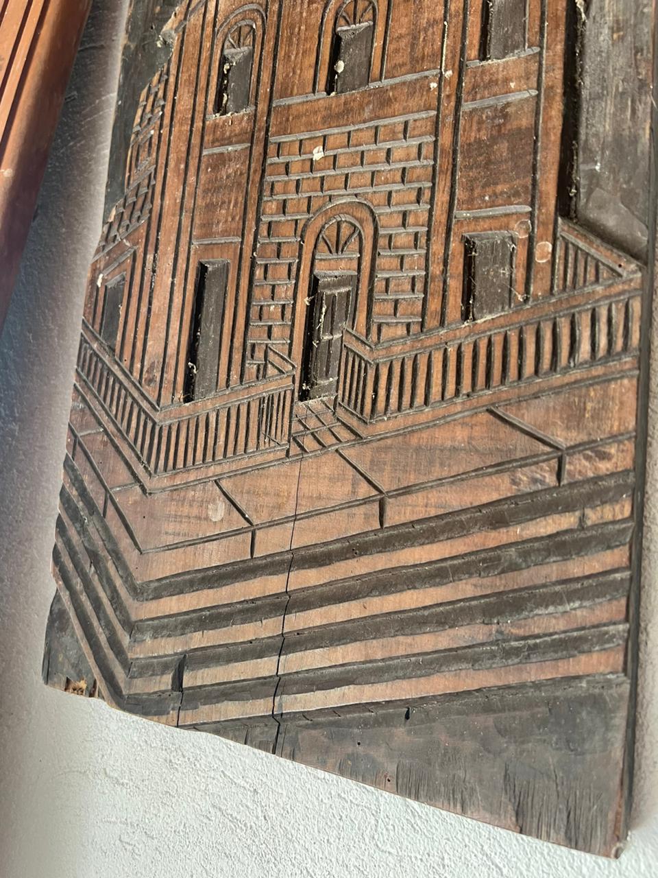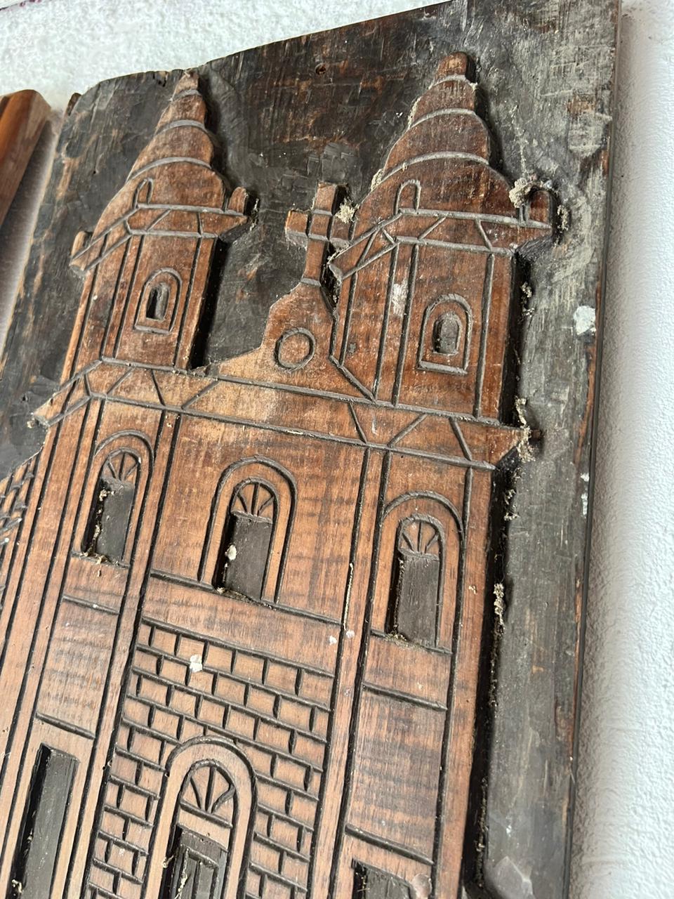 Peça decorativa, de madeira entalhada, com imagem de igreja.