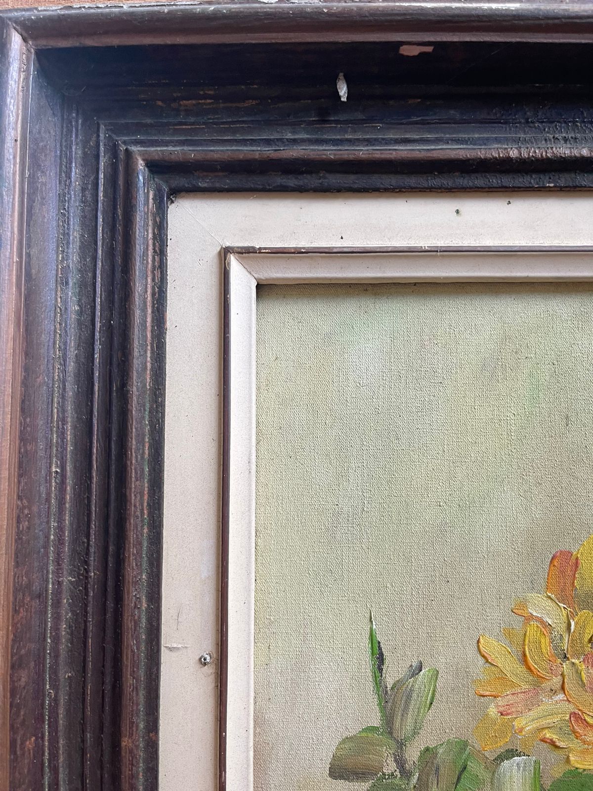 Pintado à mão, natureza morta. Com moldura de madeira.