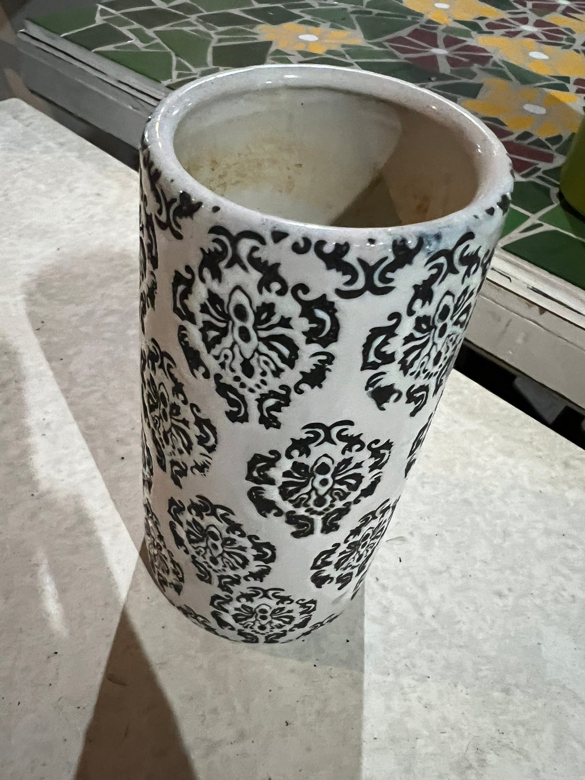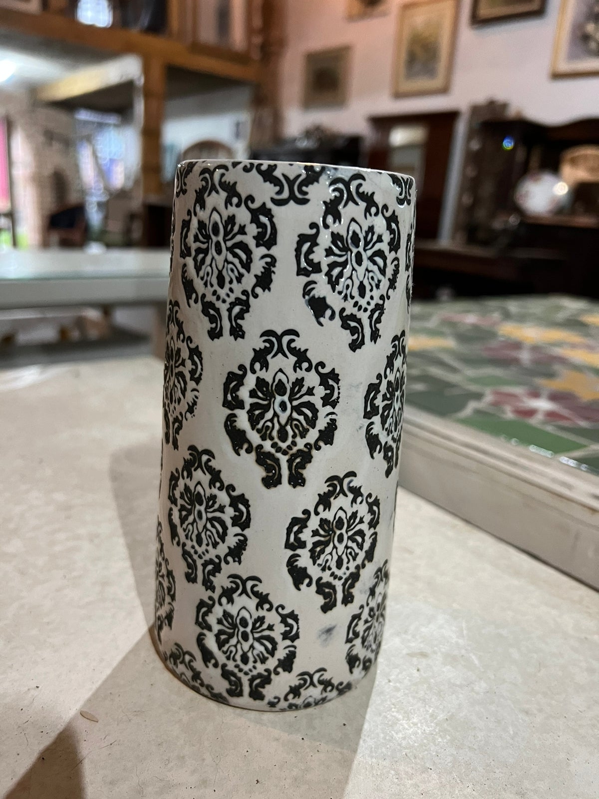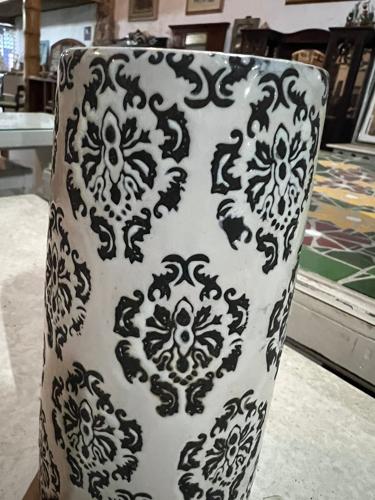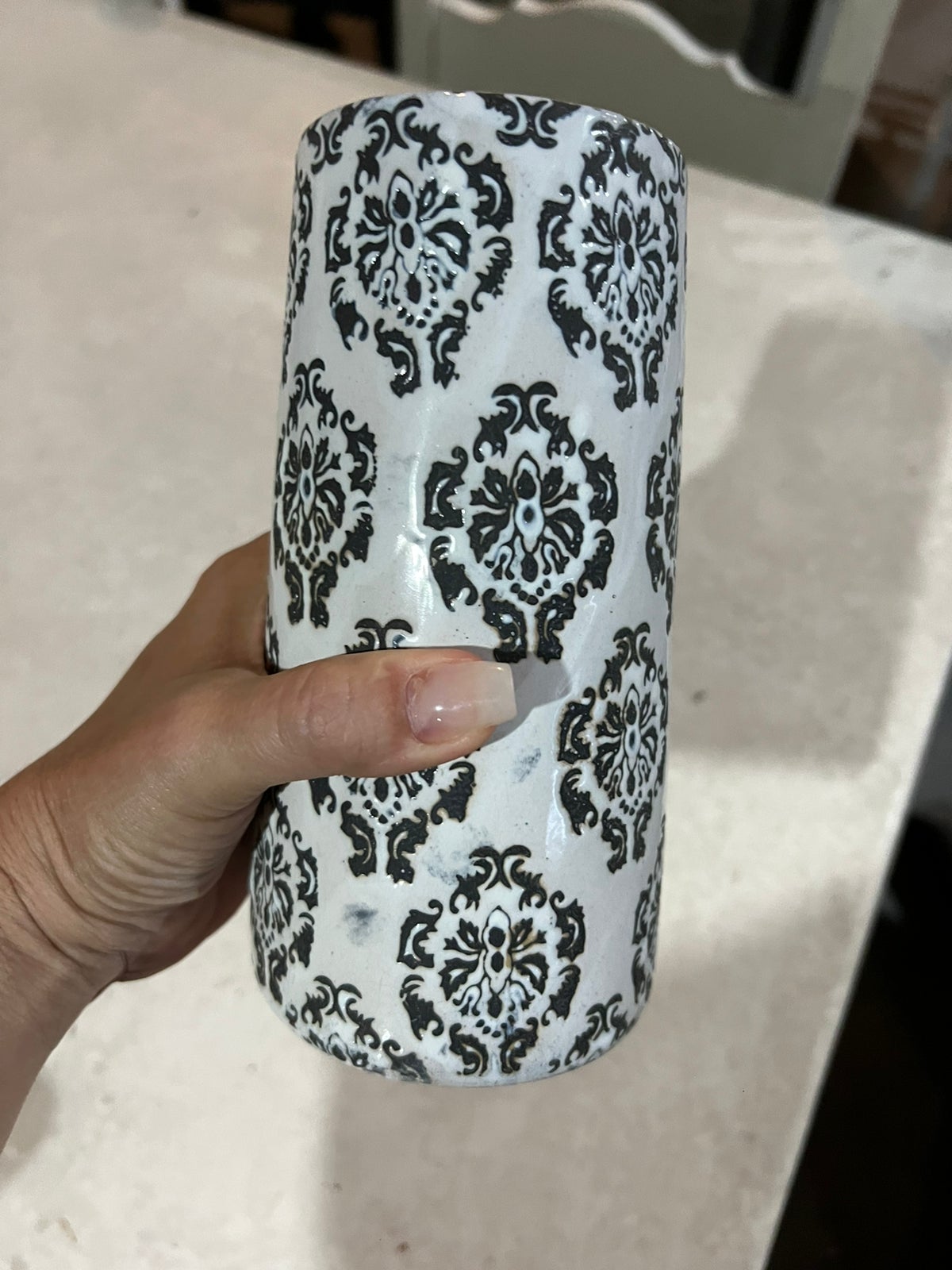 Objeto de decoração, branco com arabescos em preto.