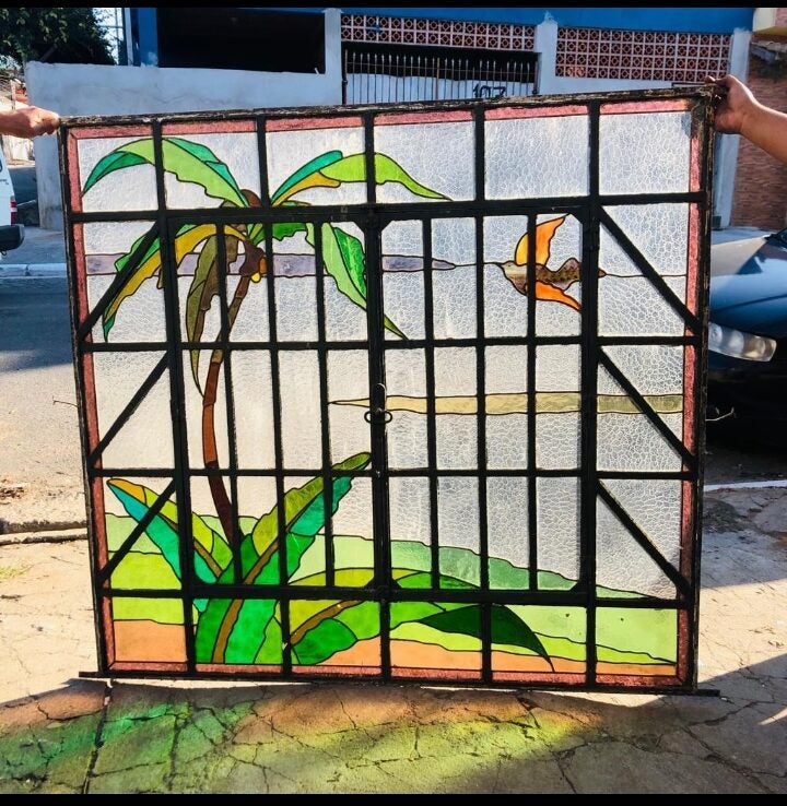 Possui estrutura em ferro fundido e chumbo, vidros coloridos e abertura central, ideal para projetos de restauração ou destaque decorativo com valor histórico.