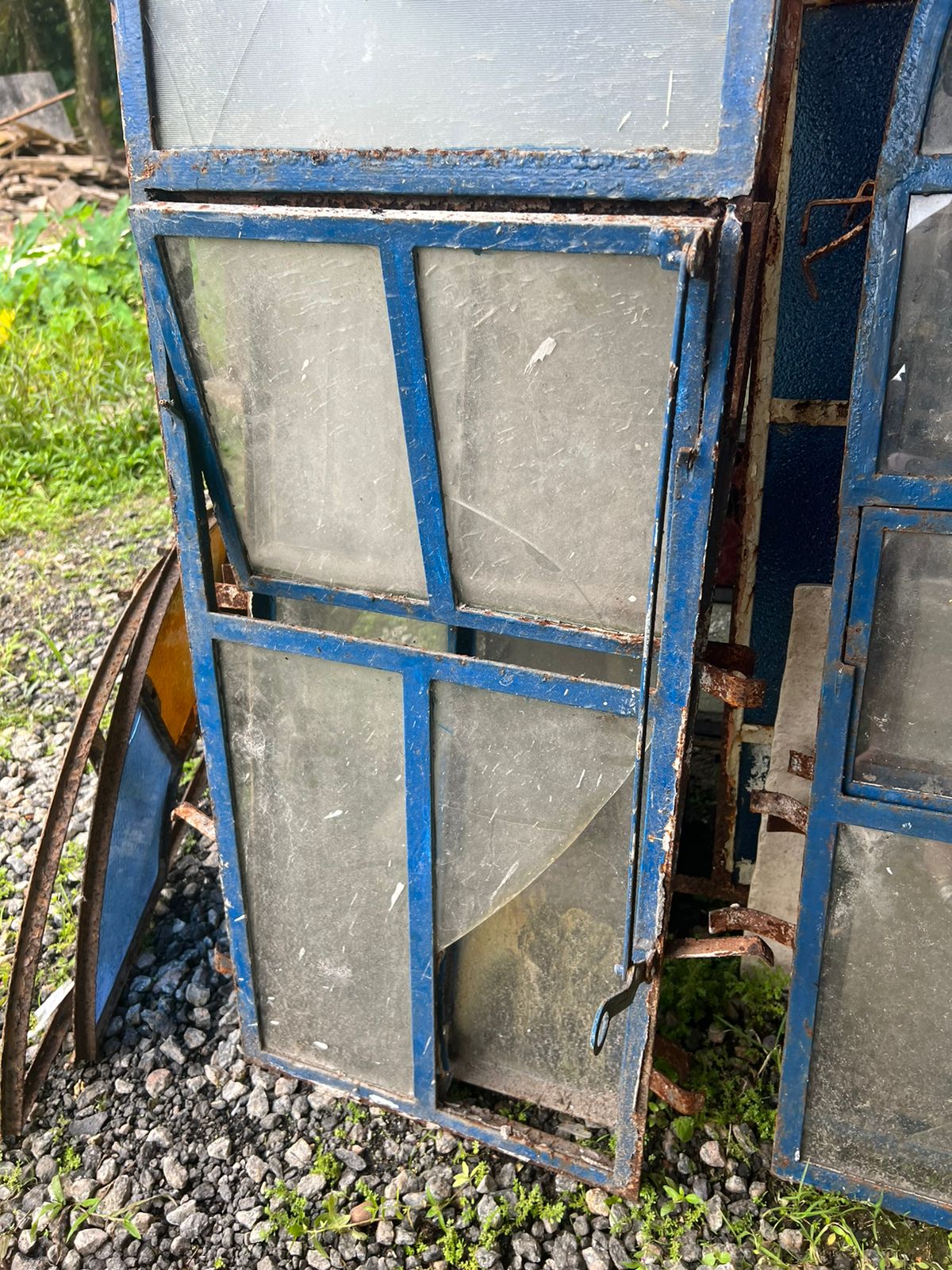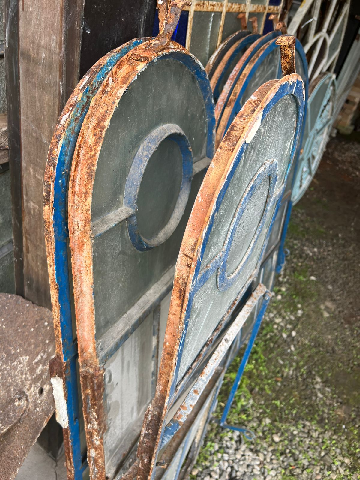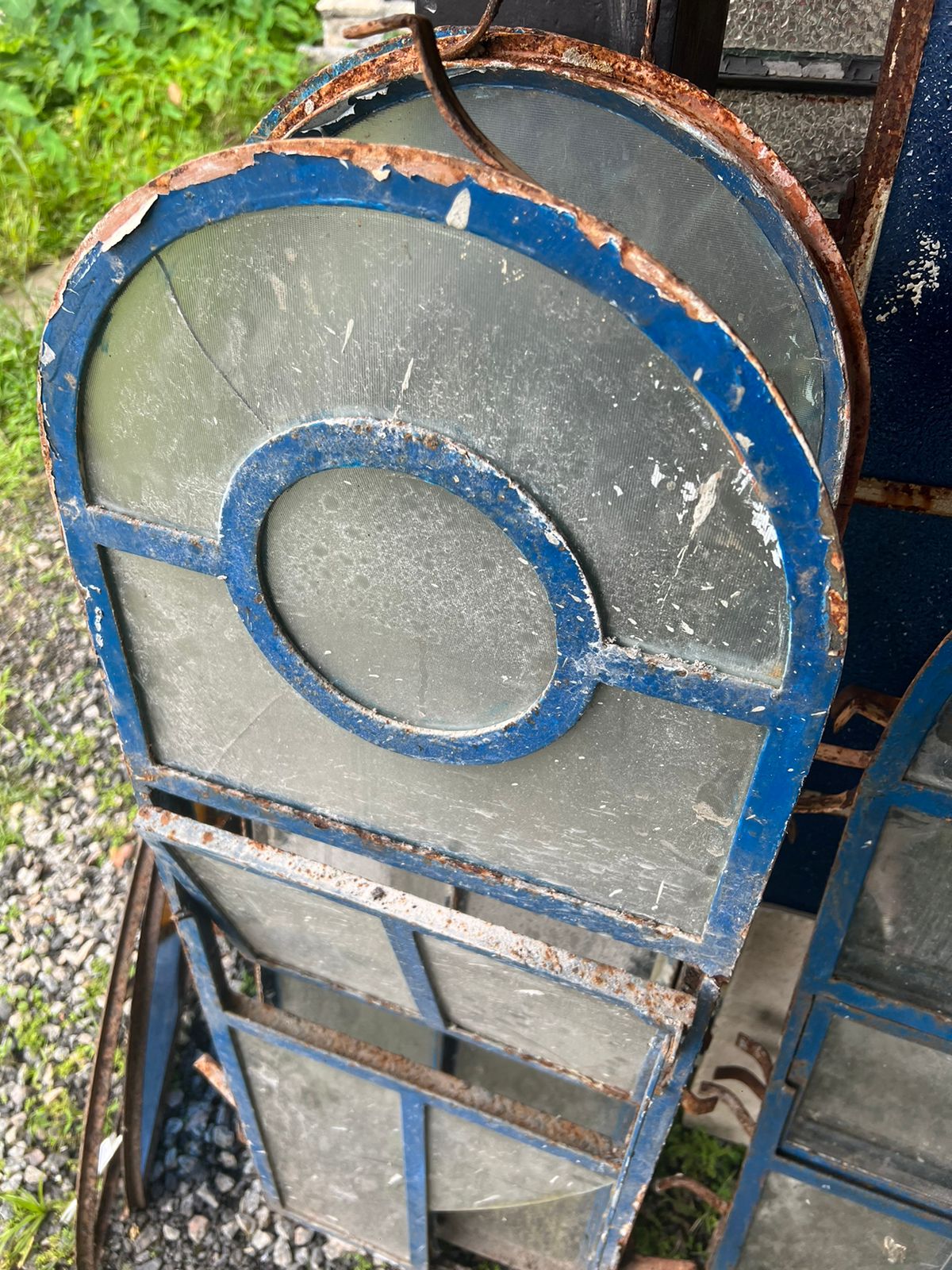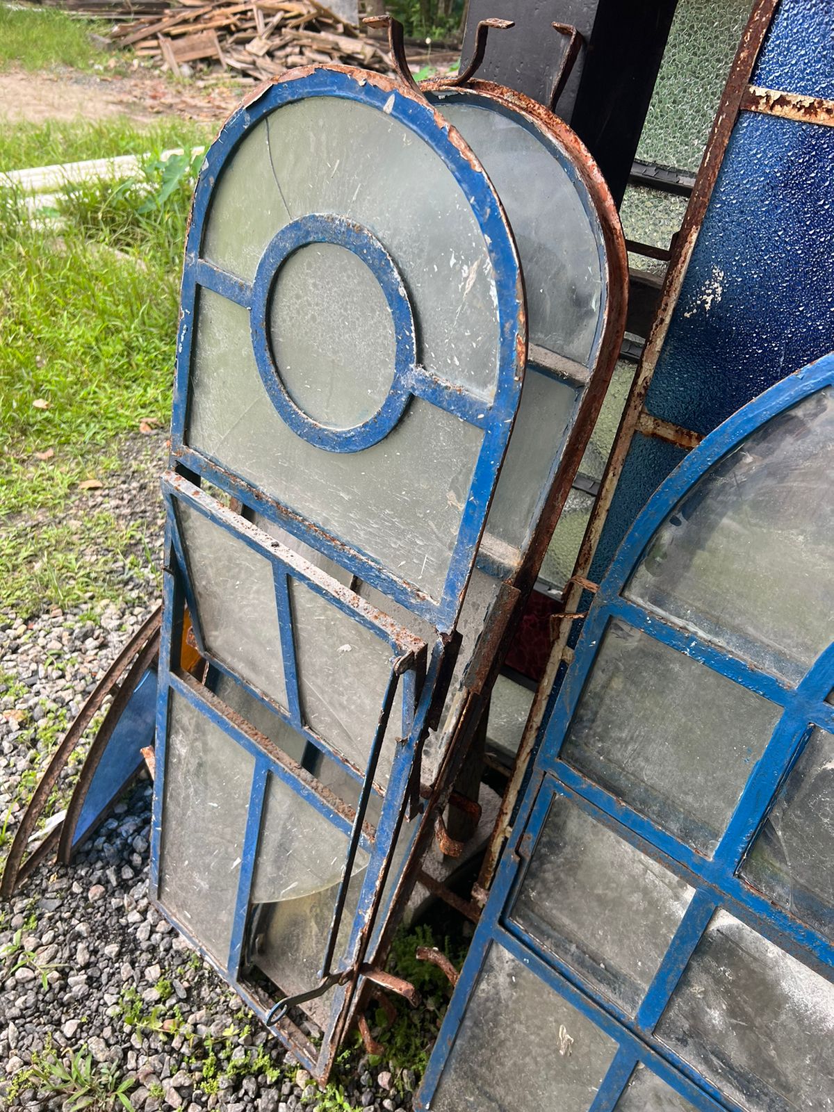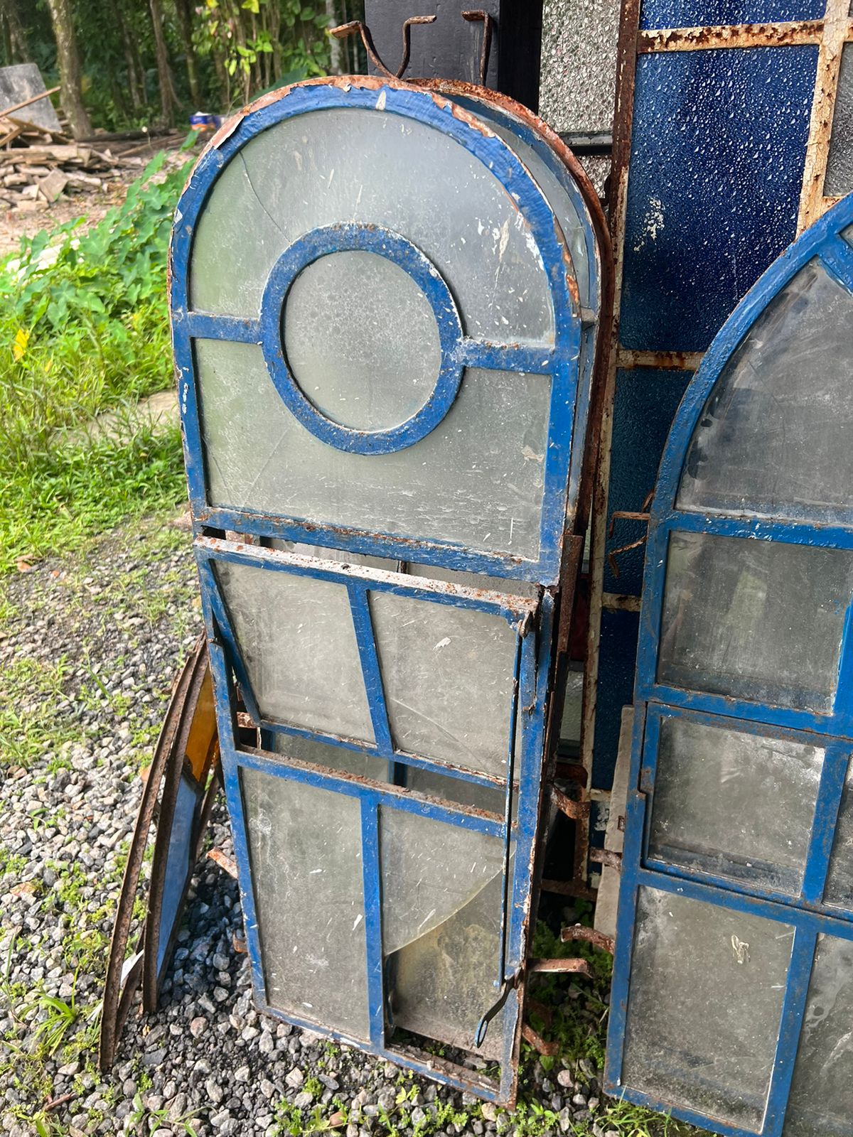 Peça de demolição, sem acabamento, na cor azul. De largura estreita, estilo capelinha, possuem vidros incolor, formato de arco na parte superior e vidros basculante.