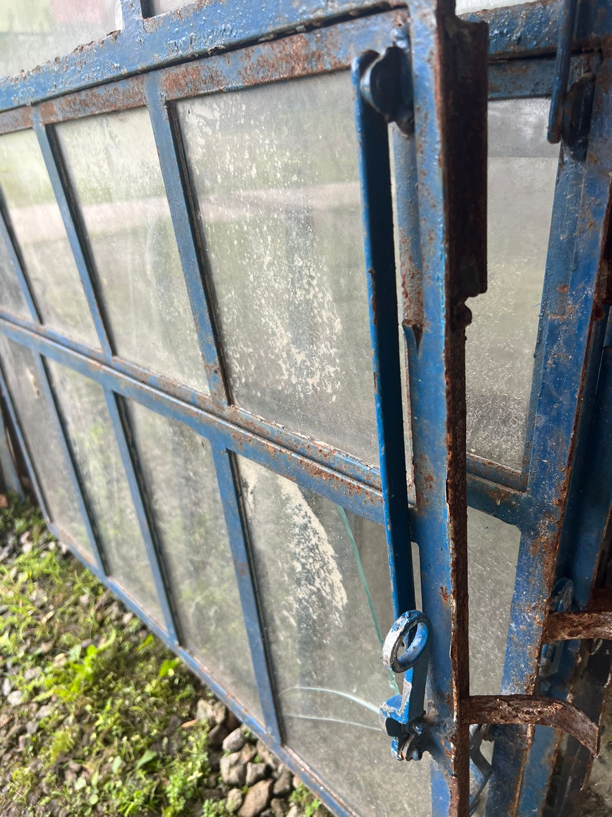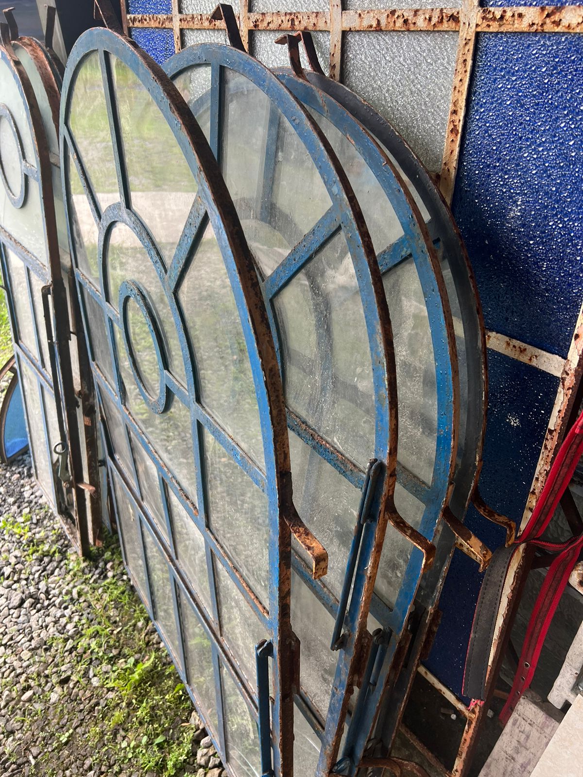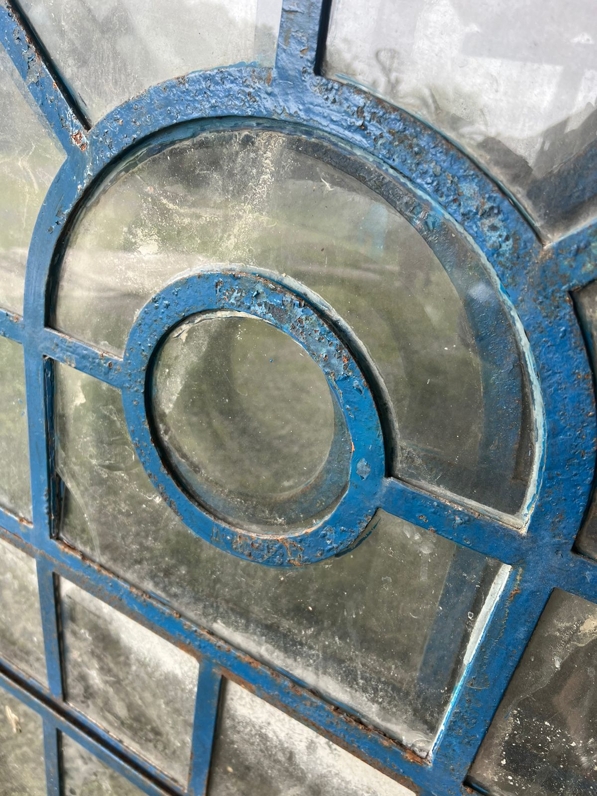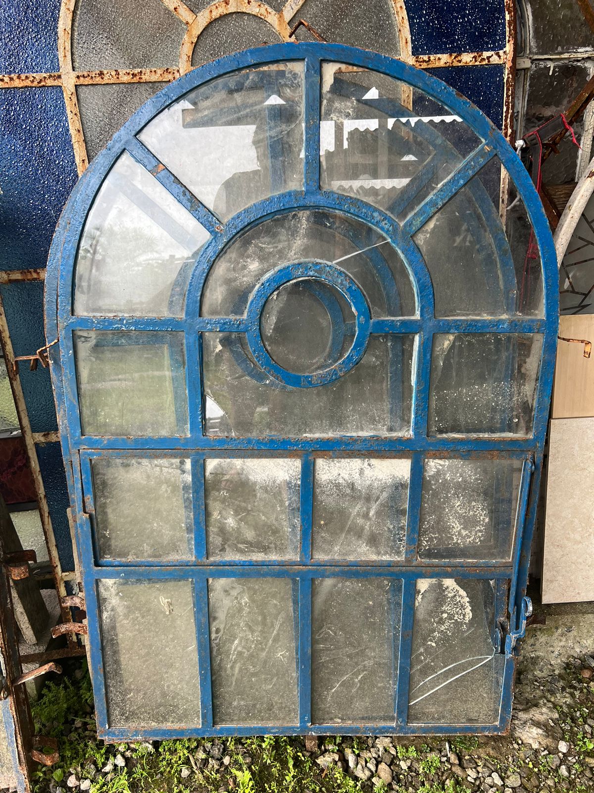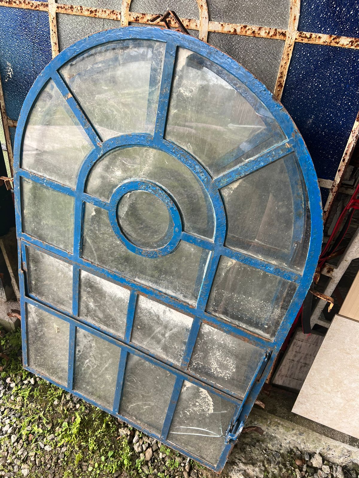 Peça de demolição, sem acabamento, na cor azul. Possui vidro incolor e forma de arco na parte superior.