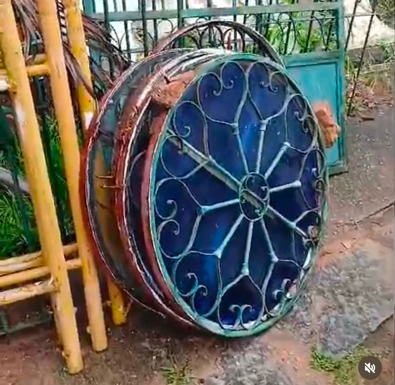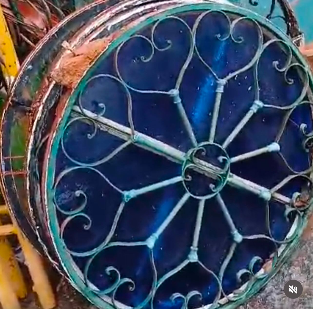 Peça de demolição. Com grade ornamentada em formato de coração, vidros antigos  com abertura basculante.
